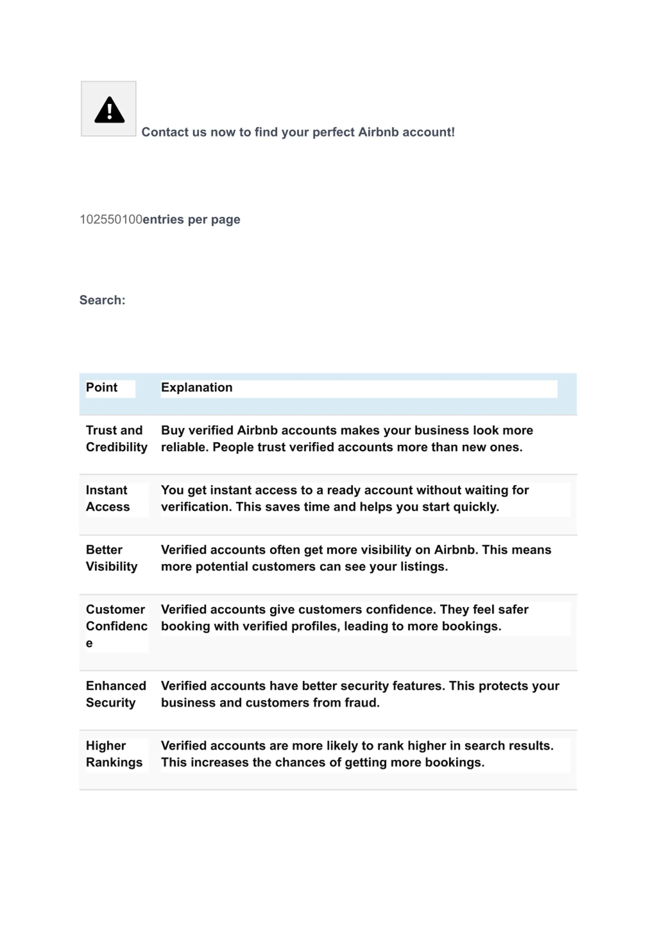 Contact us now to find your perfect Airbnb account! 102550100entries per page Search: Point Explanation Trust and Credibility Buy verified Airbnb accounts makes your business look more reliable. People trust verified accounts more than new ones. Instant Access You get instant access to a ready account without waiting for verification. This saves time and helps you start quickly. Better Visibility Verified accounts often get more visibility on Airbnb. This means more potential customers can see your listings. Customer Confidenc e Verified accounts give customers confidence. They feel safer booking with verified profiles, leading to more bookings. Enhanced Security Verified accounts have better security features. This protects your business and customers from fraud. Higher Rankings Verified accounts are more likely to rank higher in search results. This increases the chances of getting more bookings.
