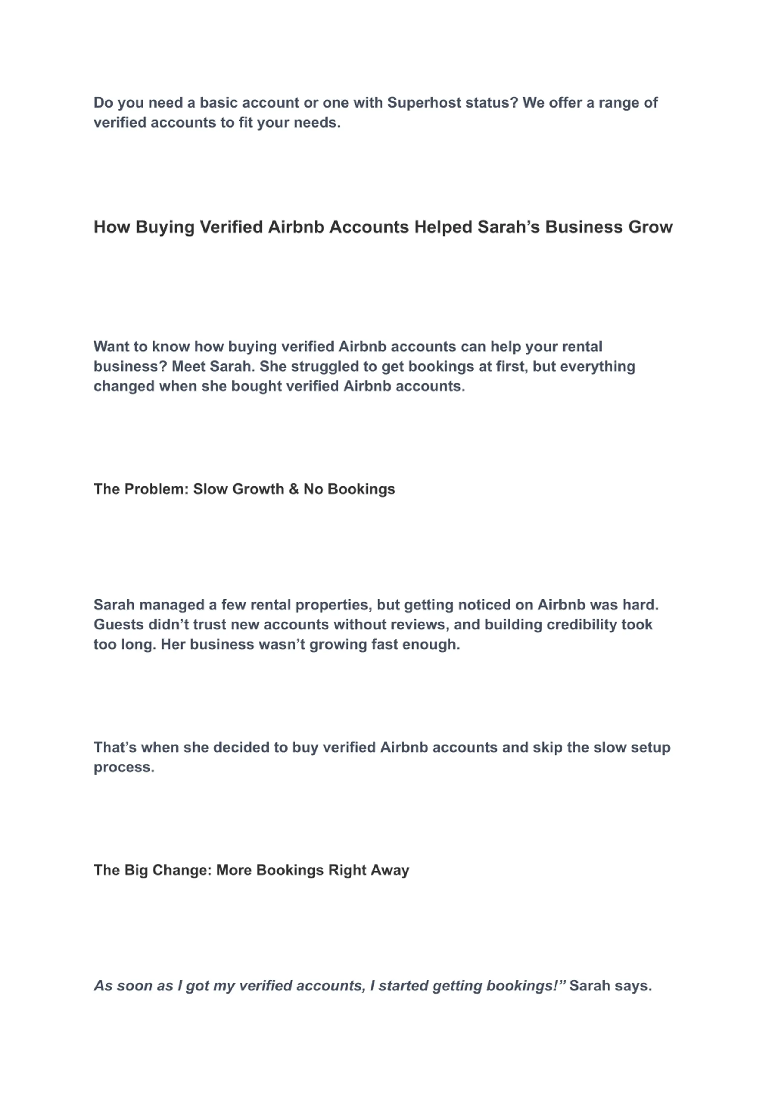 Do you need a basic account or one with Superhost status? We offer a range of verified accounts to fit your needs. How Buying Verified Airbnb Accounts Helped Sarah s Business Grow Want to know how buying verified Airbnb accounts can help your rental business? Meet Sarah. She struggled to get bookings at first, but everything changed when she bought verified Airbnb accounts. The Problem: Slow Growth & No Bookings Sarah managed a few rental properties, but getting noticed on Airbnb was hard. Guests didn t trust new accounts without reviews, and building credibility took too long. Her business wasn t growing fast enough. That s when she decided to buy verified Airbnb accounts and skip the slow setup process. The Big Change: More Bookings Right Away As soon as I got my verified accounts, I started getting bookings! Sarah says.