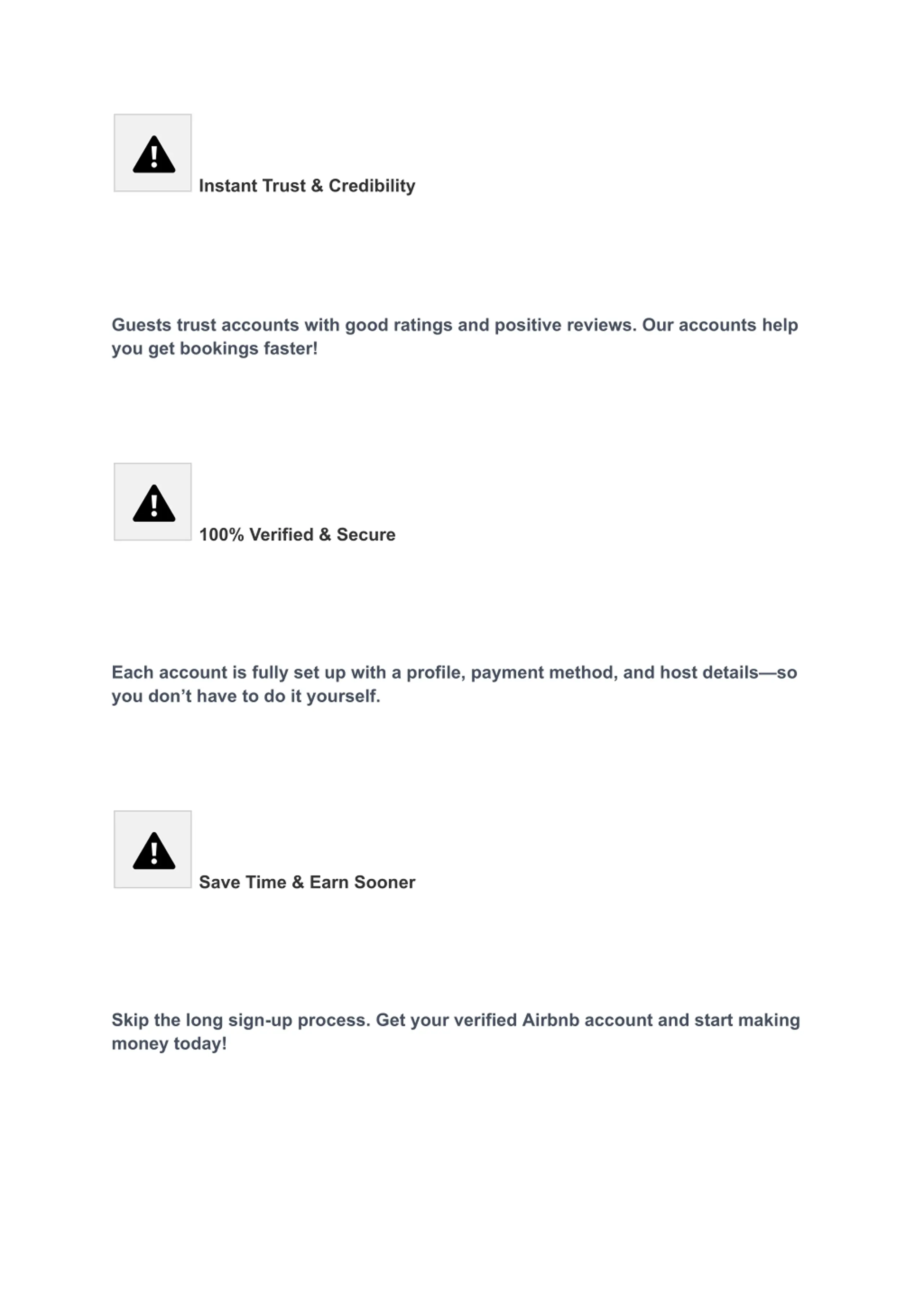 9. Experienced and Trusted Team We ve been doing this for years. We know how to do it right. 10. Your Money Is Safe With Us If something goes wrong, you get a full refund. Buy With Confidence! When you buy from us, you get a smooth and safe experience. Get your Airbnb account today!
