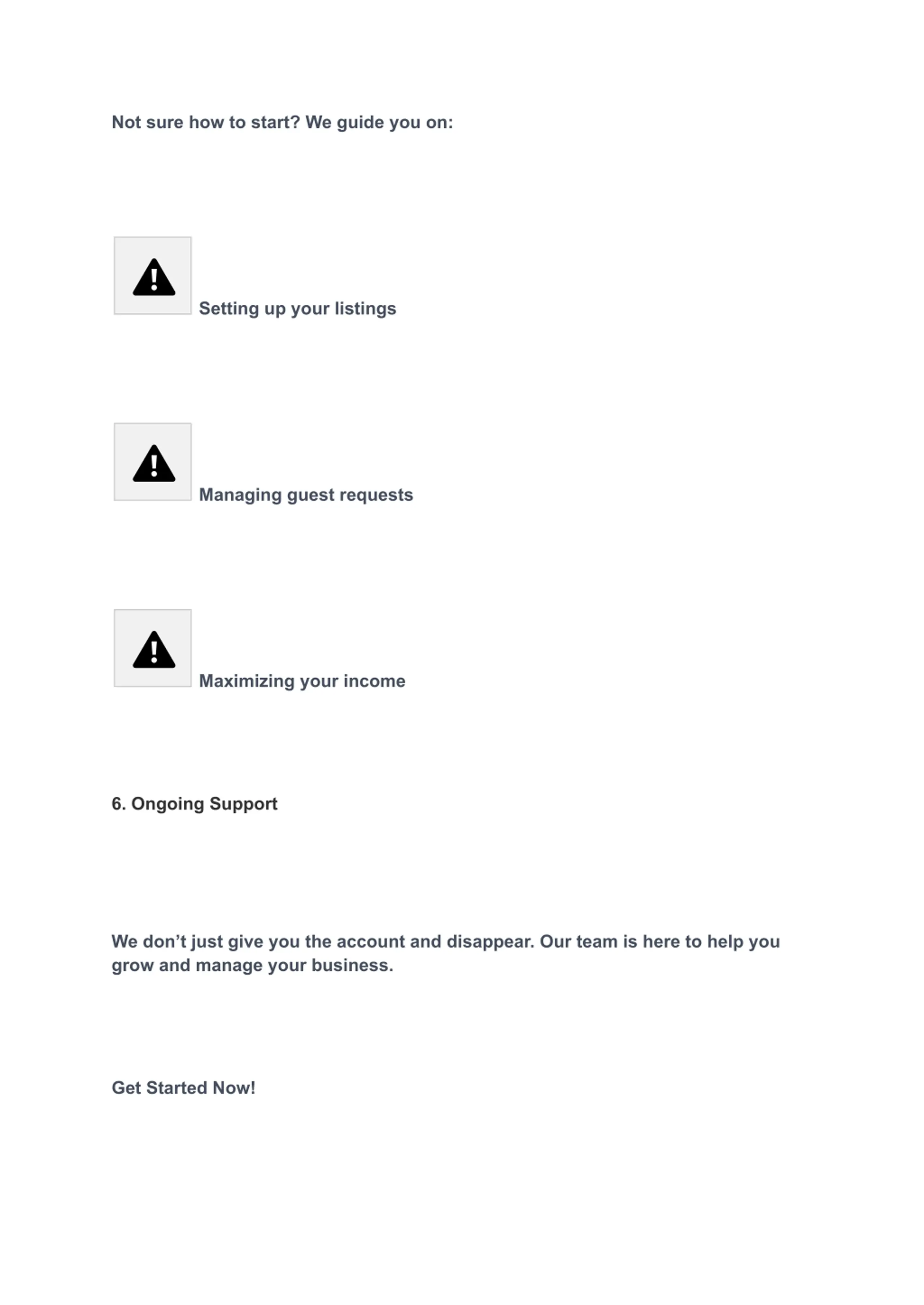 Not sure how to start? We guide you on: Setting up your listings Managing guest requests Maximizing your income 6. Ongoing Support We don t just give you the account and disappear. Our team is here to help you grow and manage your business. Get Started Now!