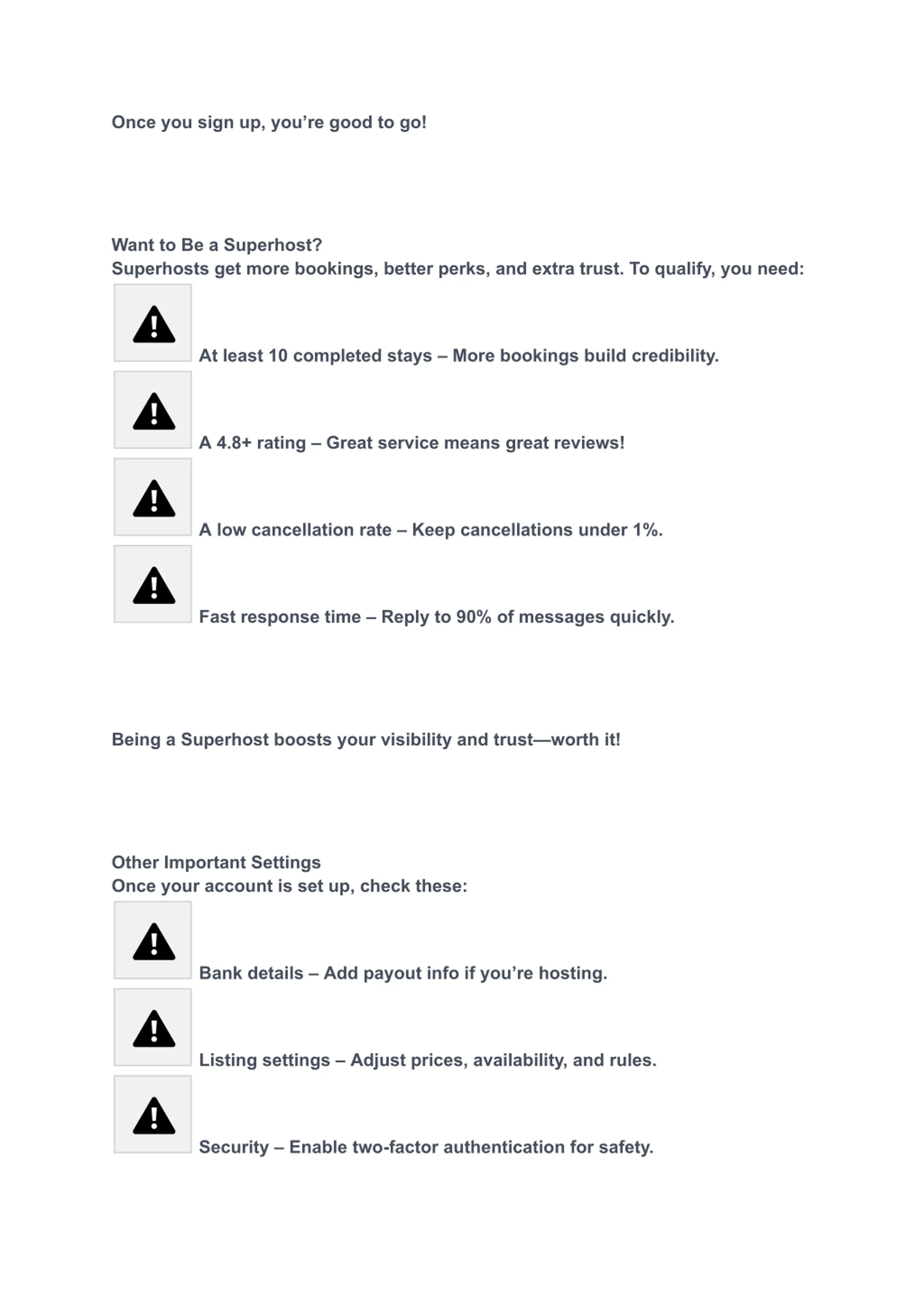 Once you sign up, youre good to go! Want to Be a Superhost? Superhosts get more bookings, better perks, and extra trust. To qualify, you need: At least 10 completed stays More bookings build credibility. A 4.8+ rating Great service means great reviews! A low cancellation rate Keep cancellations under 1%. Fast response time Reply to 90% of messages quickly. Being a Superhost boosts your visibility and trust worth it! Other Important Settings Once your account is set up, check these: Bank details Add payout info if you re hosting. Listing settings Adjust prices, availability, and rules. Security Enable two-factor authentication for safety.
