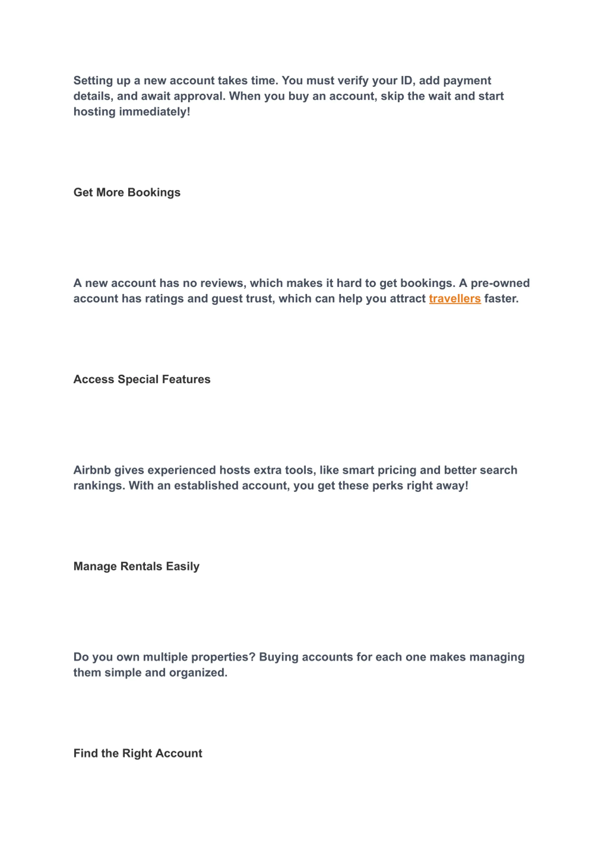 New Airbnb hosts struggle to build trust. A verified account already has good reviews and a strong reputation. This makes guests more likely to book with you. 2. Save Time Building a good Airbnb profile takes time. Buying a verified account lets you start booking guests right away. You can focus on hosting instead of waiting for reviews. 3. Show Up in More Searches Airbnb favours trusted hosts in search results. A verified account helps your listing appear higher, leading to more views and bookings. 4. Make Guests Feel Safe A verified account with great reviews shows guests they can trust you. Happy guests leave good reviews, bringing even more bookings. 5. Stand Out from the Competition