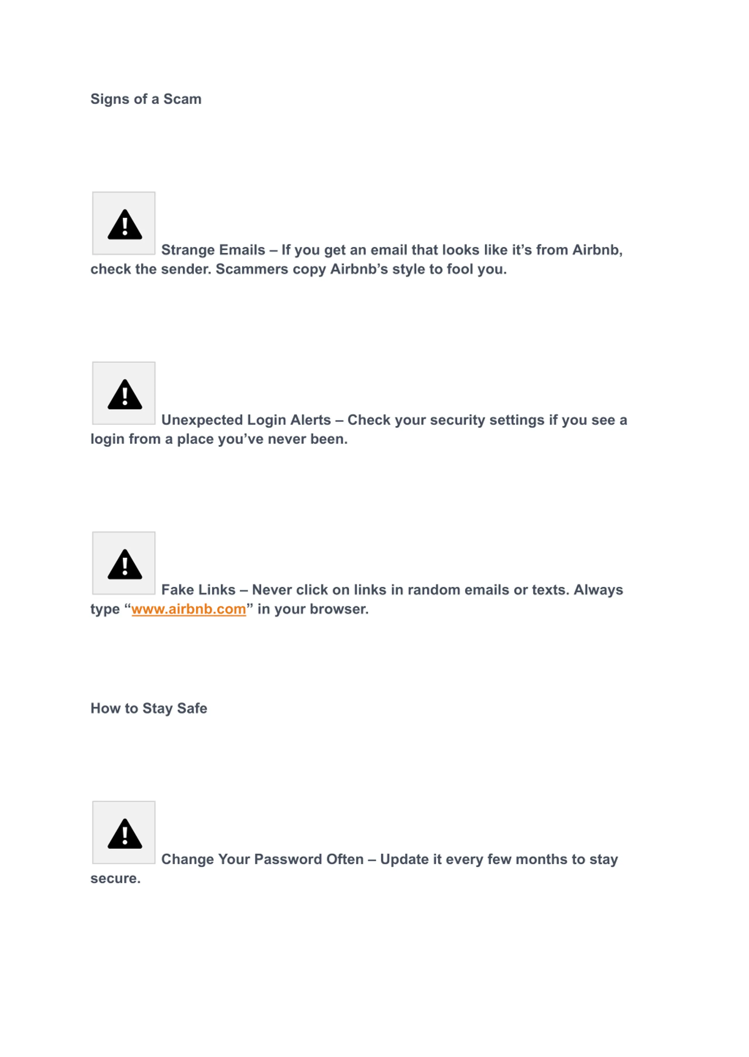 Signs of a Scam Strange Emails If you get an email that looks like it s from Airbnb, check the sender. Scammers copy Airbnb s style to fool you. Unexpected Login Alerts Check your security settings if you see a login from a place you ve never been. Fake Links Never click on links in random emails or texts. Always type www.airbnb.com in your browser. How to Stay Safe Change Your Password Often Update it every few months to stay secure.