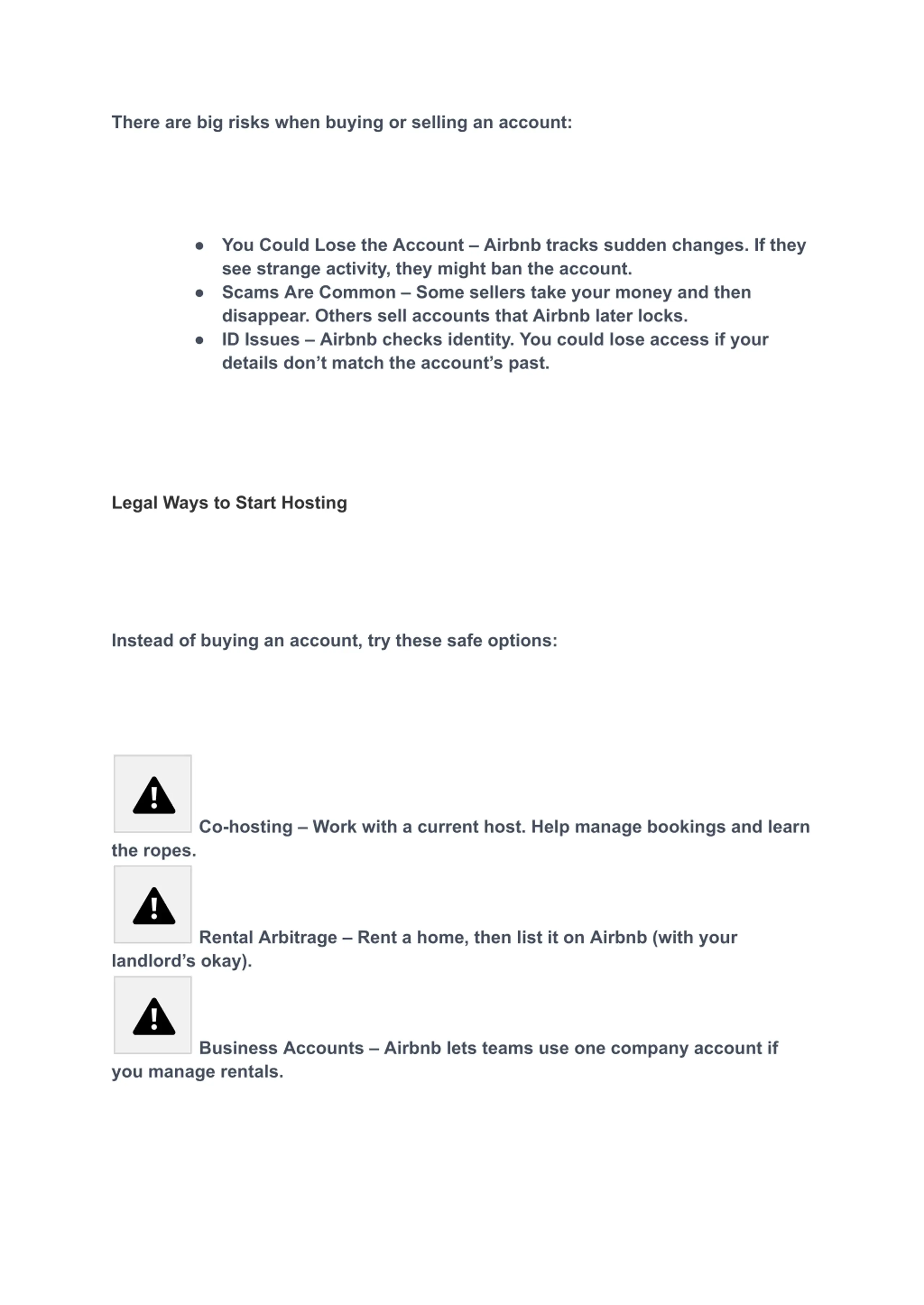 There are big risks when buying or selling an account: You Could Lose the Account Airbnb tracks sudden changes. If they see strange activity, they might ban the account. Scams Are Common Some sellers take your money and then disappear. Others sell accounts that Airbnb later locks. ID Issues Airbnb checks identity. You could lose access if your details don t match the account s past. Legal Ways to Start Hosting Instead of buying an account, try these safe options: Co-hosting Work with a current host. Help manage bookings and learn the ropes. Rental Arbitrage Rent a home, then list it on Airbnb (with your landlord s okay). Business Accounts Airbnb lets teams use one company account if you manage rentals.