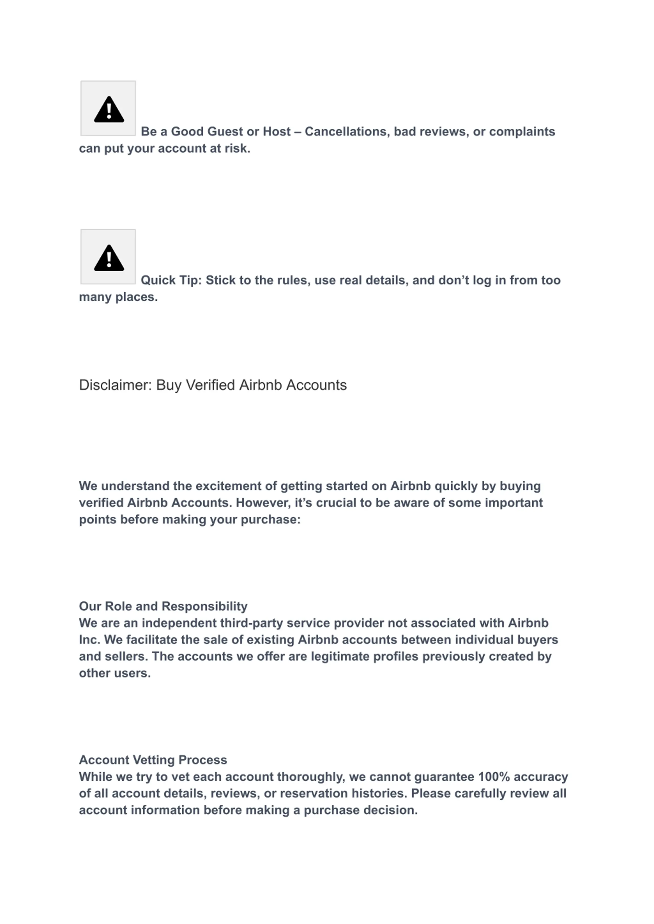 Be a Good Guest or Host Cancellations, bad reviews, or complaints can put your account at risk. Quick Tip: Stick to the rules, use real details, and don t log in from too many places. Disclaimer: Buy Verified Airbnb Accounts We understand the excitement of getting started on Airbnb quickly by buying verified Airbnb Accounts. However, it s crucial to be aware of some important points before making your purchase: Our Role and Responsibility We are an independent third-party service provider not associated with Airbnb Inc. We facilitate the sale of existing Airbnb accounts between individual buyers and sellers. The accounts we offer are legitimate profiles previously created by other users. Account Vetting Process While we try to vet each account thoroughly, we cannot guarantee 100% accuracy of all account details, reviews, or reservation histories. Please carefully review all account information before making a purchase decision.