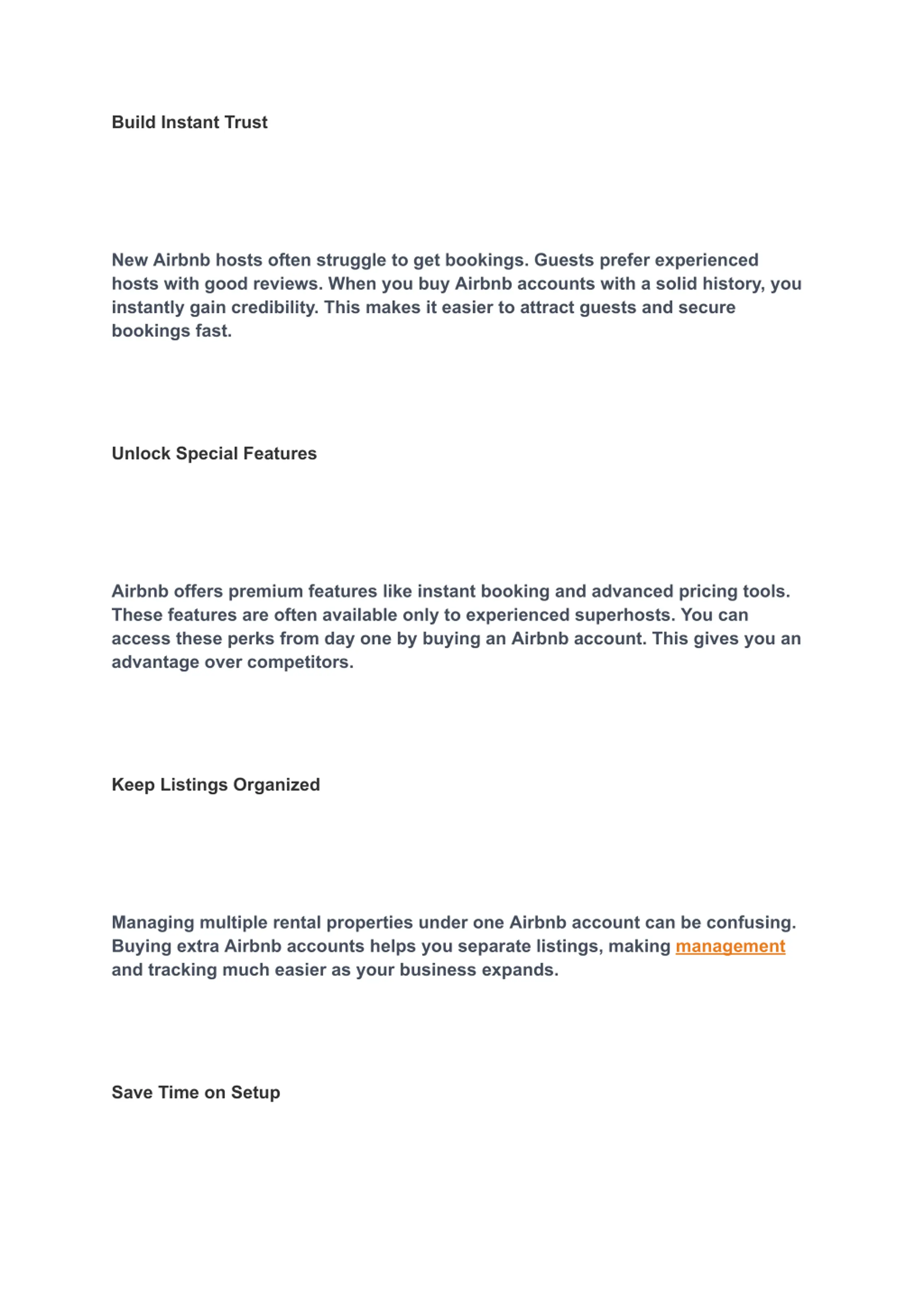 Build Instant Trust New Airbnb hosts often struggle to get bookings. Guests prefer experienced hosts with good reviews. When you buy Airbnb accounts with a solid history, you instantly gain credibility. This makes it easier to attract guests and secure bookings fast. Unlock Special Features Airbnb offers premium features like instant booking and advanced pricing tools. These features are often available only to experienced superhosts. You can access these perks from day one by buying an Airbnb account. This gives you an advantage over competitors. Keep Listings Organized Managing multiple rental properties under one Airbnb account can be confusing. Buying extra Airbnb accounts helps you separate listings, making management and tracking much easier as your business expands. Save Time on Setup