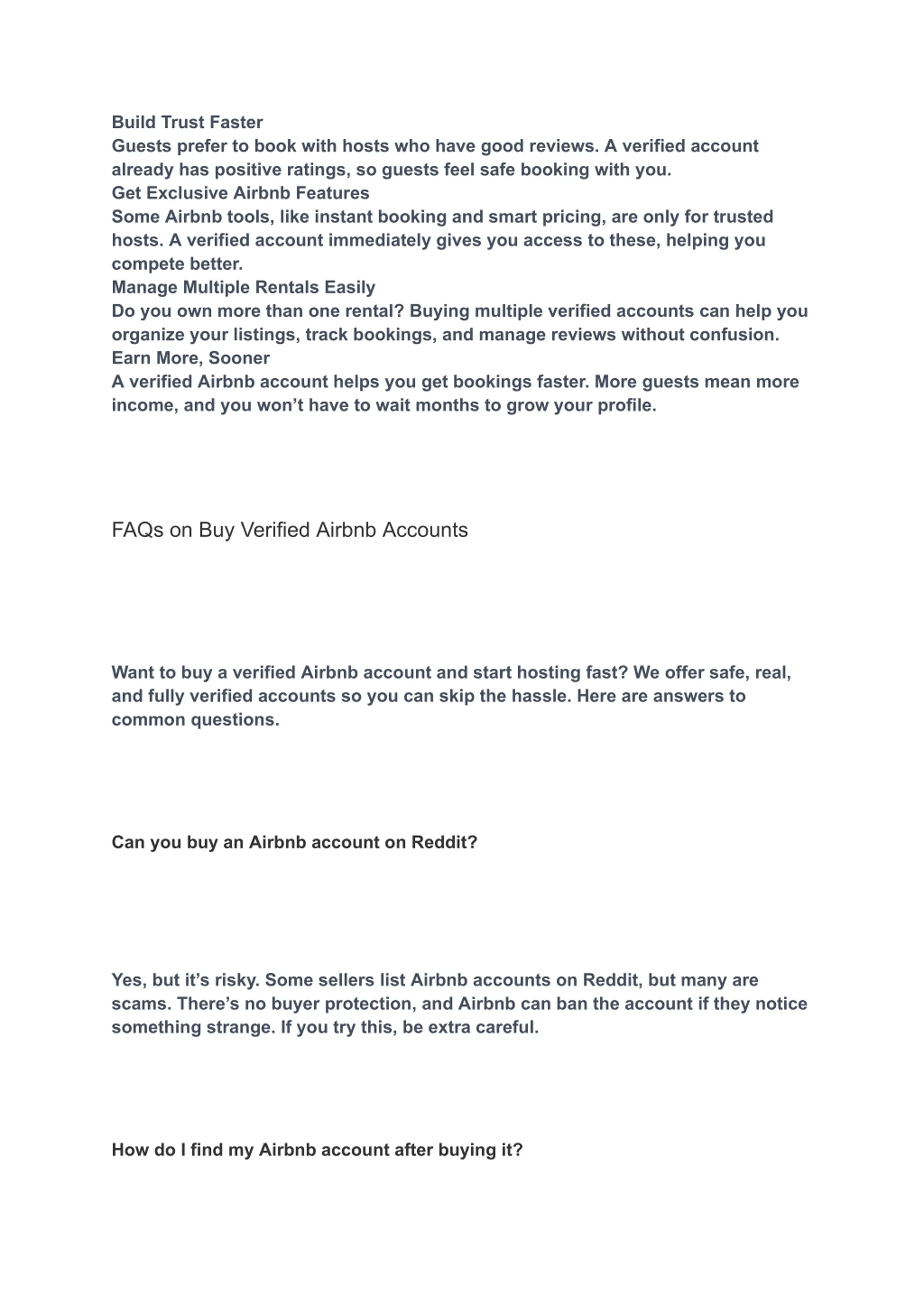Build Trust Faster Guests prefer to book with hosts who have good reviews. A verified account already has positive ratings, so guests feel safe booking with you. Get Exclusive Airbnb Features Some Airbnb tools, like instant booking and smart pricing, are only for trusted hosts. A verified account immediately gives you access to these, helping you compete better. Manage Multiple Rentals Easily Do you own more than one rental? Buying multiple verified accounts can help you organize your listings, track bookings, and manage reviews without confusion. Earn More, Sooner A verified Airbnb account helps you get bookings faster. More guests mean more income, and you won t have to wait months to grow your profile. FAQs on Buy Verified Airbnb Accounts Want to buy a verified Airbnb account and start hosting fast? We offer safe, real, and fully verified accounts so you can skip the hassle. Here are answers to common questions. Can you buy an Airbnb account on Reddit? Yes, but it s risky. Some sellers list Airbnb accounts on Reddit, but many are scams. There s no buyer protection, and Airbnb can ban the account if they notice something strange. If you try this, be extra careful. How do I find my Airbnb account after buying it?