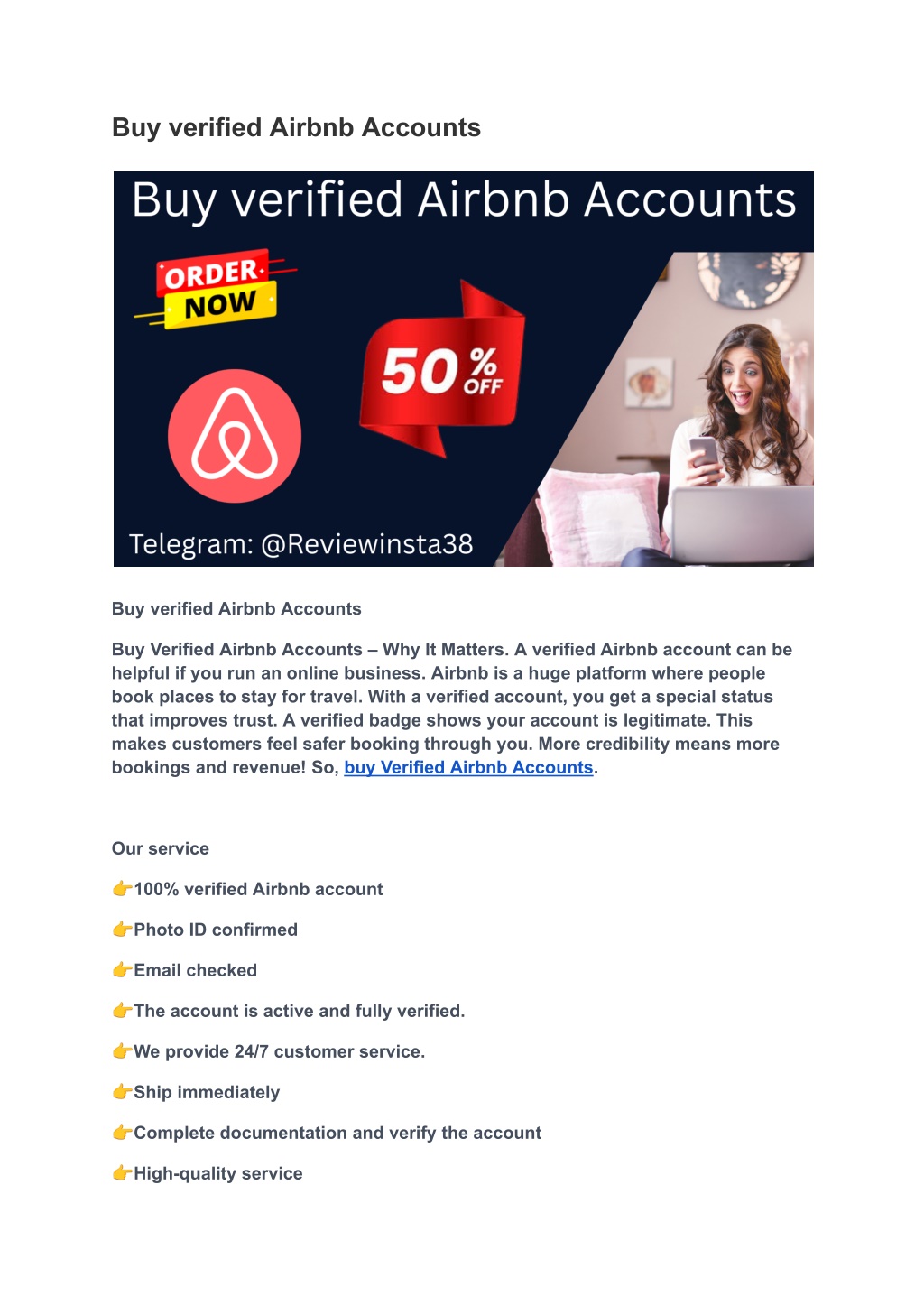 ?Low price per account ?Provide full access ?Available in all countries Airbnb account 24-hour response/contact Email: reviewinsta38@gmail.com Telegram: @Reviewinsta38 Skype: Reviewinsta WhatsApp: +1 (717) 896-0147 https://reviewinsta.com/shop/buy-verified-airbnb-accounts/ Buy Verified Airbnb Accounts for Instant Hosting Want to start hosting on Airbnb fast? Creating a new account takes time. You need to verify your identity, build trust, and collect reviews. This can take weeks or even months. But there s a faster way! Buy a verified Airbnb account and start hosting right away. Skip the Setup & Save Time Making a new Airbnb account means going through a long process. You must submit details, pass verification, and get good reviews. Buying a verified Airbnb account helps you skip all that hassle. You can start listing your property immediately.
