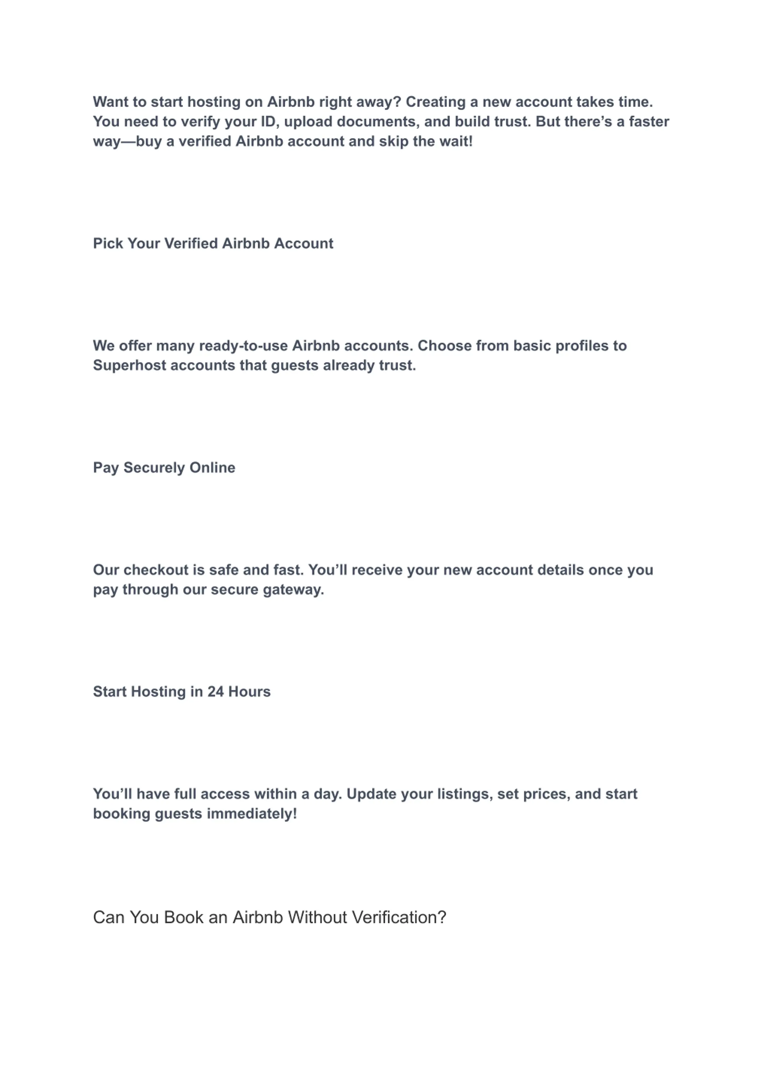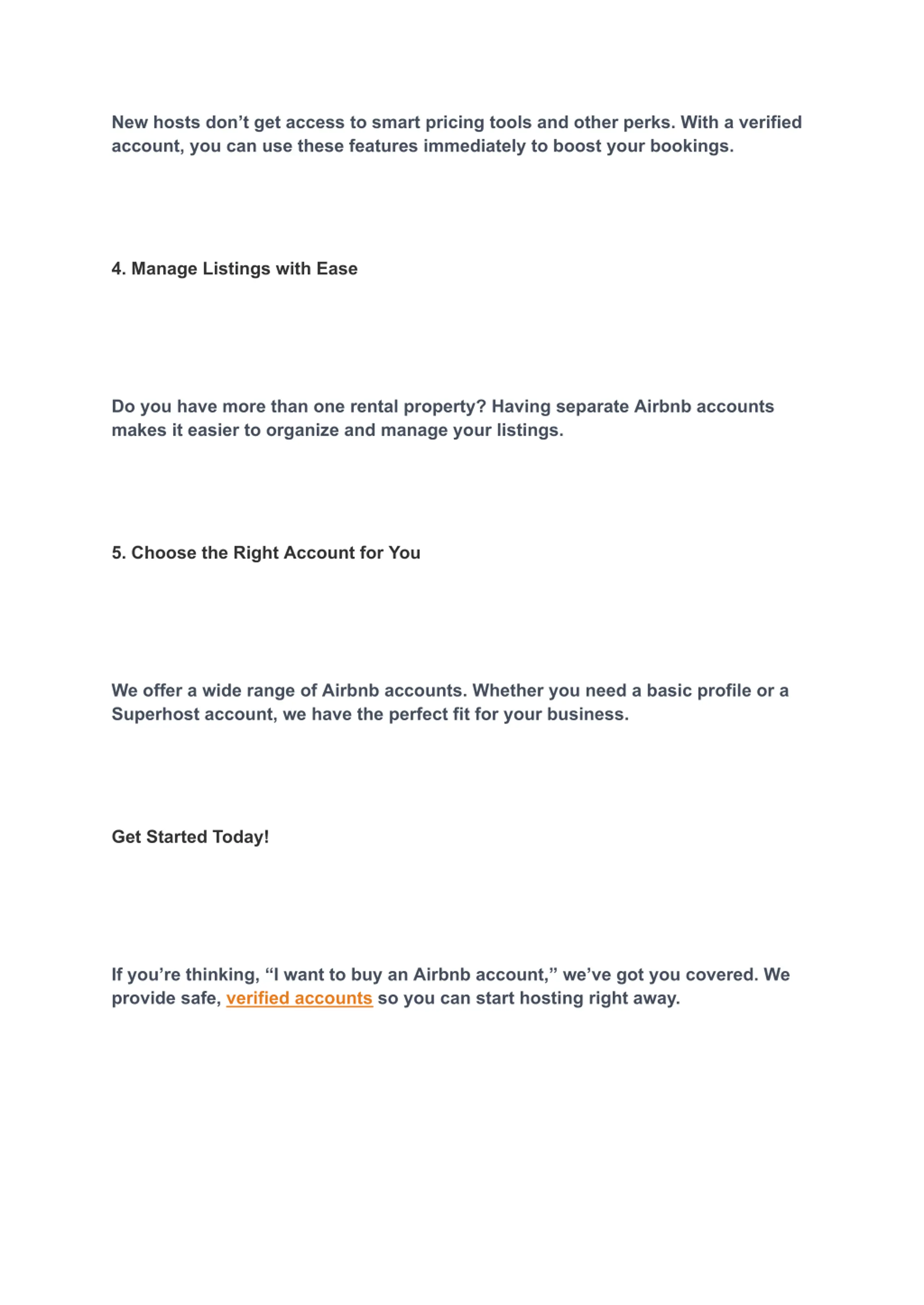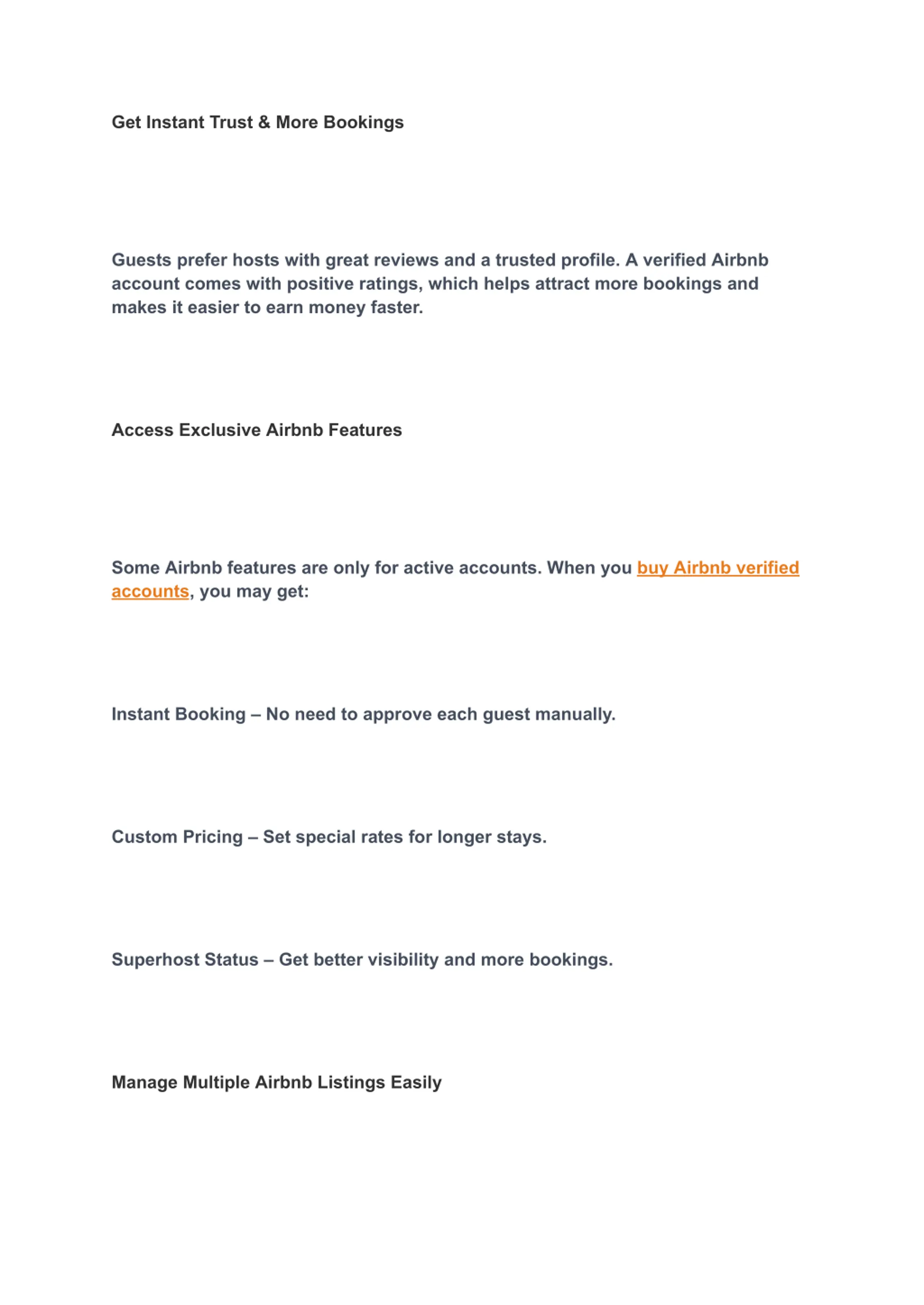 New hosts dont get access to smart pricing tools and other perks. With a verified account, you can use these features immediately to boost your bookings. 4. Manage Listings with Ease Do you have more than one rental property? Having separate Airbnb accounts makes it easier to organize and manage your listings. 5. Choose the Right Account for You We offer a wide range of Airbnb accounts. Whether you need a basic profile or a Superhost account, we have the perfect fit for your business. Get Started Today! If you re thinking, I want to buy an Airbnb account, we ve got you covered. We provide safe, verified accounts so you can start hosting right away.
