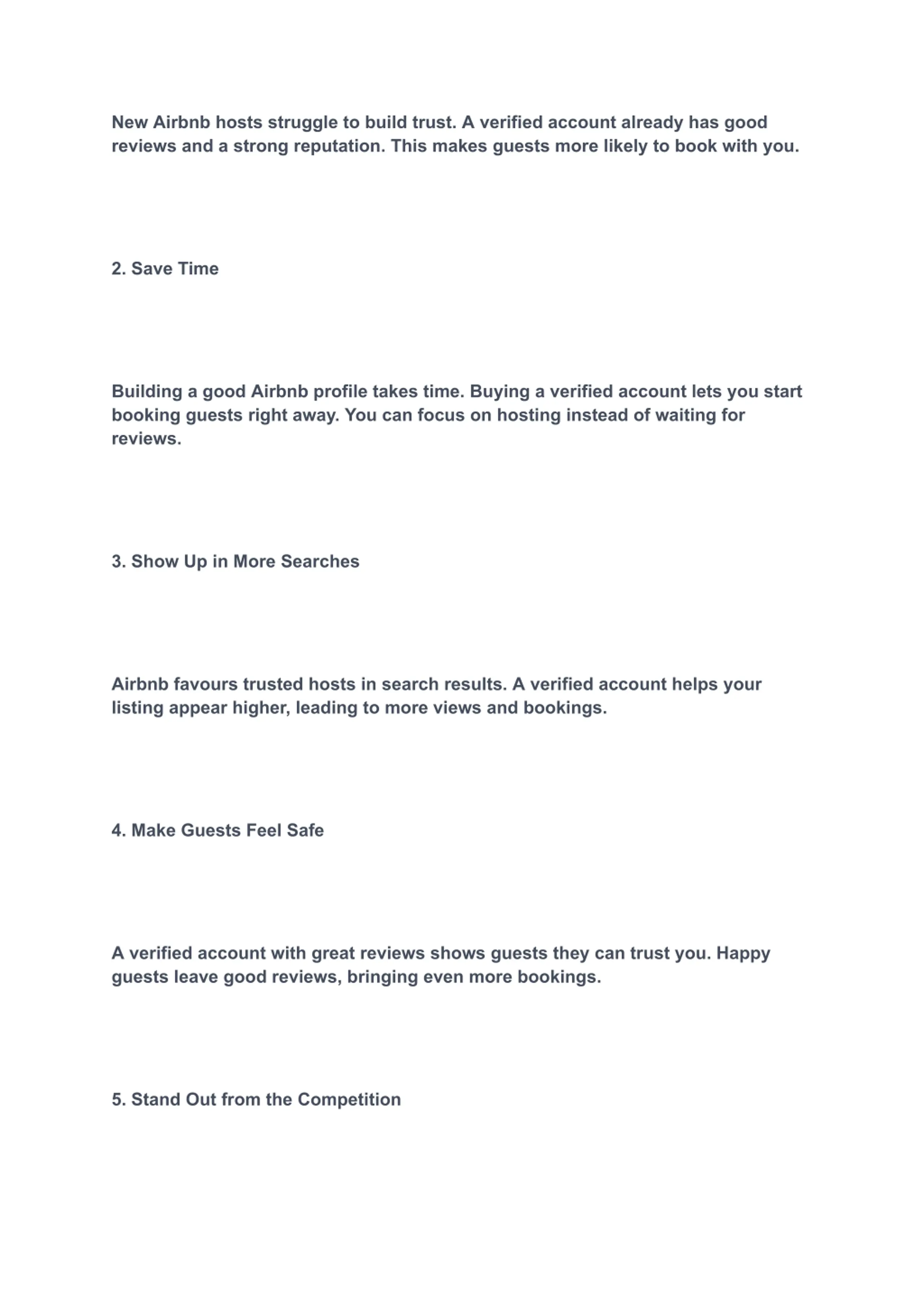 New Airbnb hosts struggle to build trust. A verified account already has good reviews and a strong reputation. This makes guests more likely to book with you. 2. Save Time Building a good Airbnb profile takes time. Buying a verified account lets you start booking guests right away. You can focus on hosting instead of waiting for reviews. 3. Show Up in More Searches Airbnb favours trusted hosts in search results. A verified account helps your listing appear higher, leading to more views and bookings. 4. Make Guests Feel Safe A verified account with great reviews shows guests they can trust you. Happy guests leave good reviews, bringing even more bookings. 5. Stand Out from the Competition