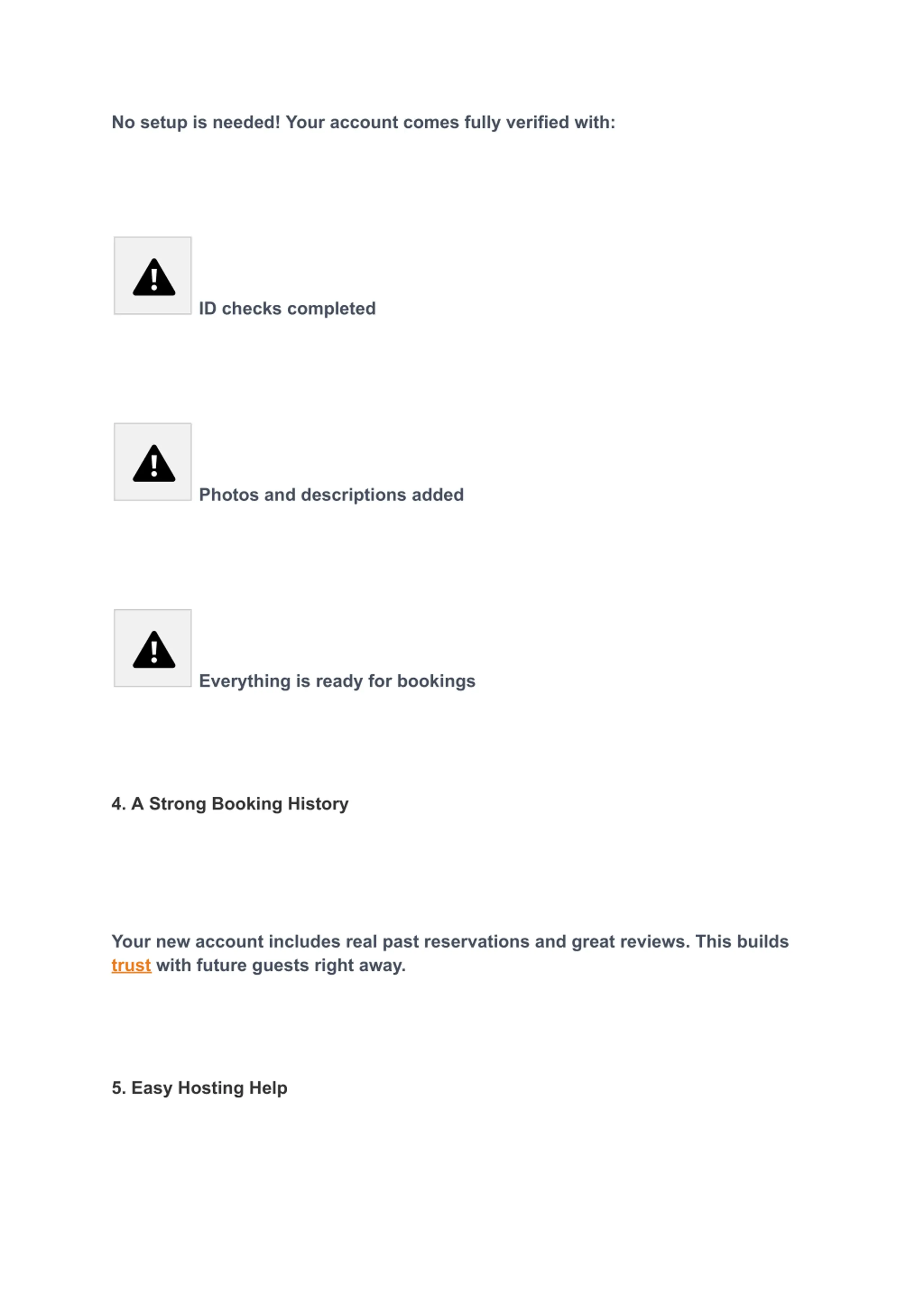 No setup is needed! Your account comes fully verified with: ID checks completed Photos and descriptions added Everything is ready for bookings 4. A Strong Booking History Your new account includes real past reservations and great reviews. This builds trust with future guests right away. 5. Easy Hosting Help