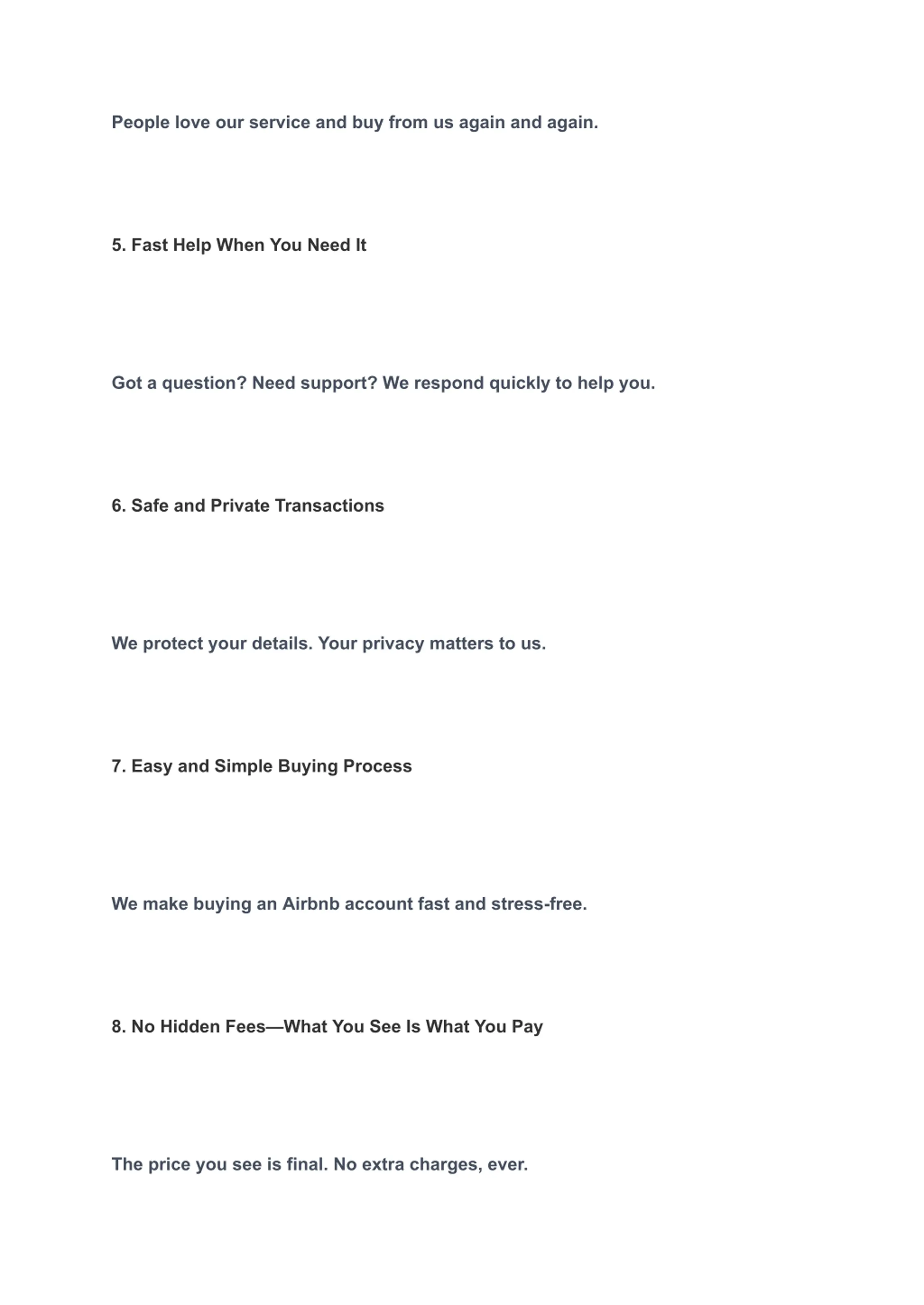People love our service and buy from us again and again. 5. Fast Help When You Need It Got a question? Need support? We respond quickly to help you. 6. Safe and Private Transactions We protect your details. Your privacy matters to us. 7. Easy and Simple Buying Process We make buying an Airbnb account fast and stress-free. 8. No Hidden Fees What You See Is What You Pay The price you see is final. No extra charges, ever.