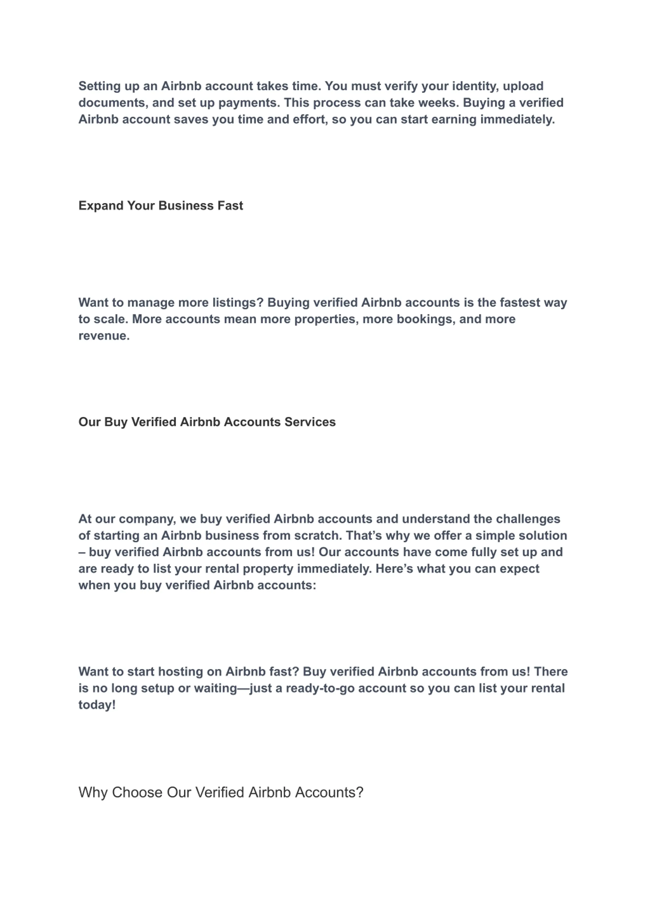 Setting up an Airbnb account takes time. You must verify your identity, upload documents, and set up payments. This process can take weeks. Buying a verified Airbnb account saves you time and effort, so you can start earning immediately. Expand Your Business Fast Want to manage more listings? Buying verified Airbnb accounts is the fastest way to scale. More accounts mean more properties, more bookings, and more revenue. Our Buy Verified Airbnb Accounts Services At our company, we buy verified Airbnb accounts and understand the challenges of starting an Airbnb business from scratch. That s why we offer a simple solution buy verified Airbnb accounts from us! Our accounts have come fully set up and are ready to list your rental property immediately. Here s what you can expect when you buy verified Airbnb accounts: Want to start hosting on Airbnb fast? Buy verified Airbnb accounts from us! There is no long setup or waiting just a ready-to-go account so you can list your rental today! Why Choose Our Verified Airbnb Accounts?