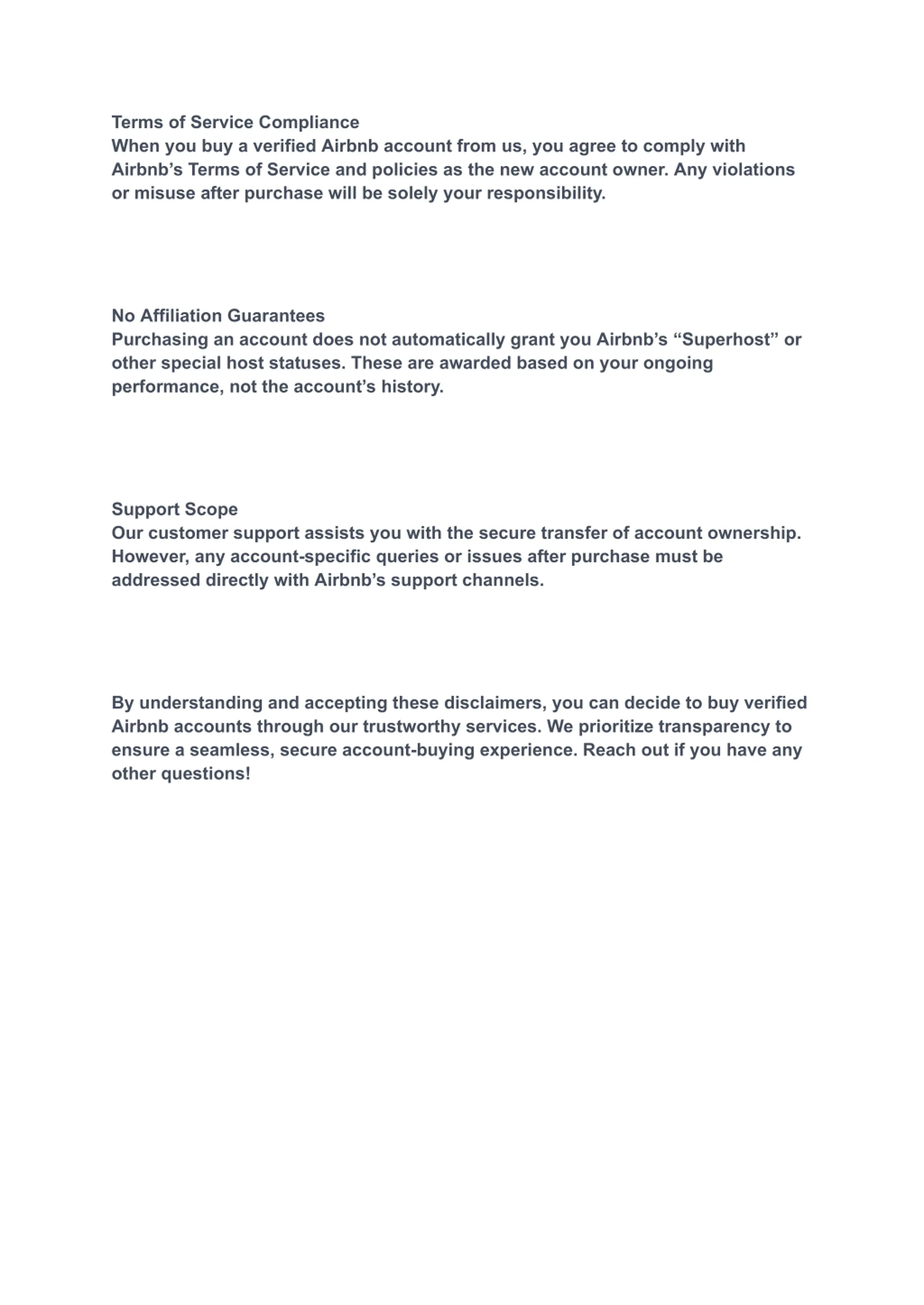 Terms of Service Compliance When you buy a verified Airbnb account from us, you agree to comply with Airbnb s Terms of Service and policies as the new account owner. Any violations or misuse after purchase will be solely your responsibility. No Affiliation Guarantees Purchasing an account does not automatically grant you Airbnb s Superhost or other special host statuses. These are awarded based on your ongoing performance, not the account s history. Support Scope Our customer support assists you with the secure transfer of account ownership. However, any account-specific queries or issues after purchase must be addressed directly with Airbnb s support channels. By understanding and accepting these disclaimers, you can decide to buy verified Airbnb accounts through our trustworthy services. We prioritize transparency to ensure a seamless, secure account-buying experience. Reach out if you have any other questions!