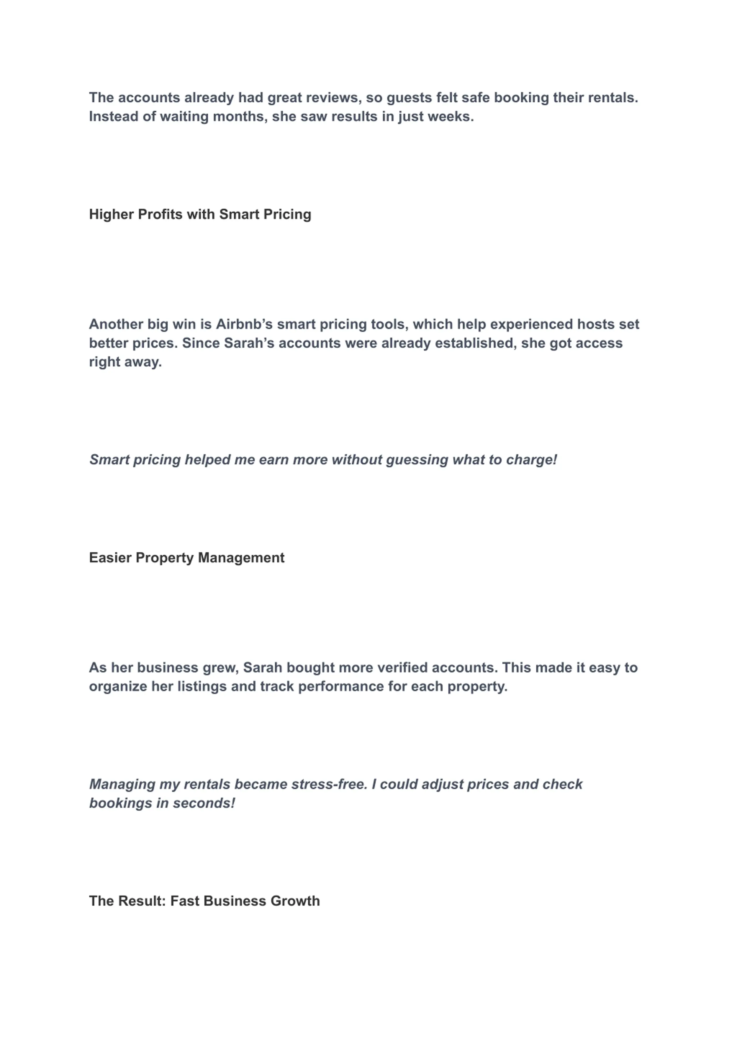 In just a year, Sarahs rental business tripled in size. I went from struggling with a few listings to running a successful Airbnb business. I couldn t have done it without verified accounts! Want to Grow Your Rental Business Faster? Sarah s story proves that buying verified Airbnb accounts can help you get more bookings, earn higher profits, and grow faster.