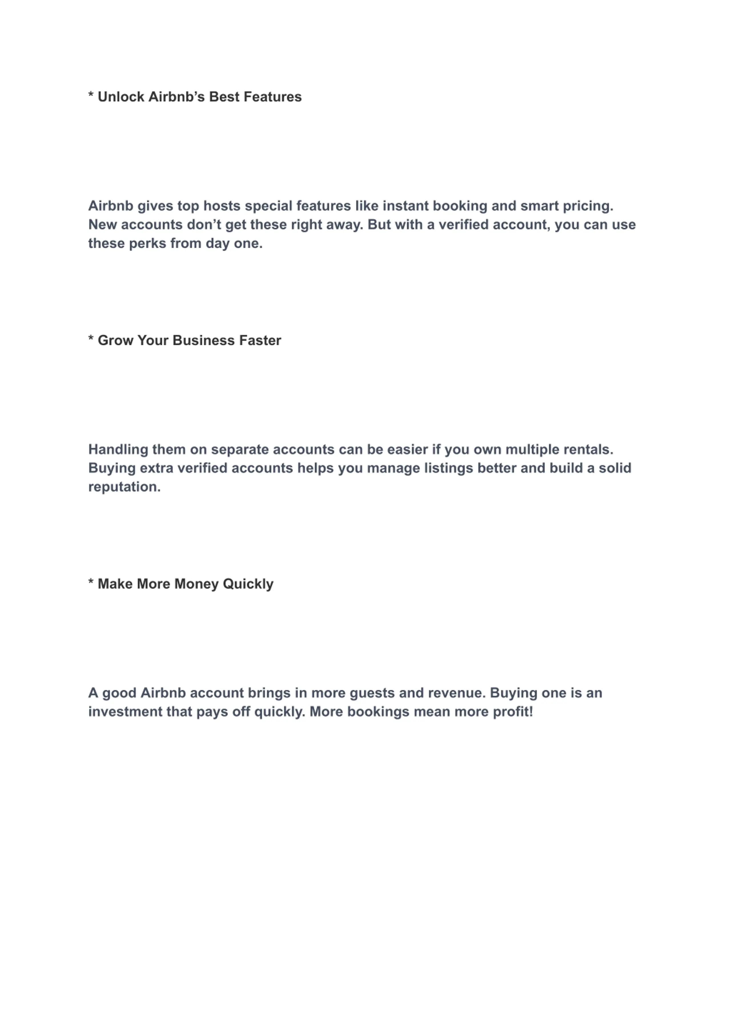 * Unlock Airbnbs Best Features Airbnb gives top hosts special features like instant booking and smart pricing. New accounts don t get these right away. But with a verified account, you can use these perks from day one. * Grow Your Business Faster Handling them on separate accounts can be easier if you own multiple rentals. Buying extra verified accounts helps you manage listings better and build a solid reputation. * Make More Money Quickly A good Airbnb account brings in more guests and revenue. Buying one is an investment that pays off quickly. More bookings mean more profit!