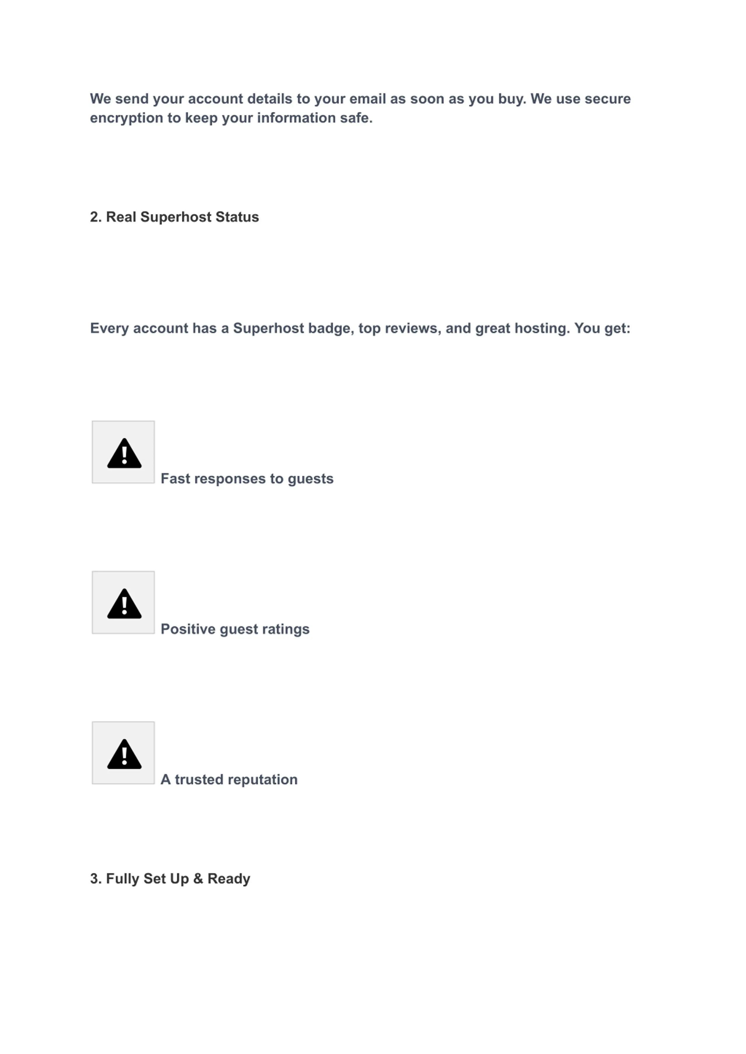 We send your account details to your email as soon as you buy. We use secure encryption to keep your information safe. 2. Real Superhost Status Every account has a Superhost badge, top reviews, and great hosting. You get: Fast responses to guests Positive guest ratings A trusted reputation 3. Fully Set Up & Ready