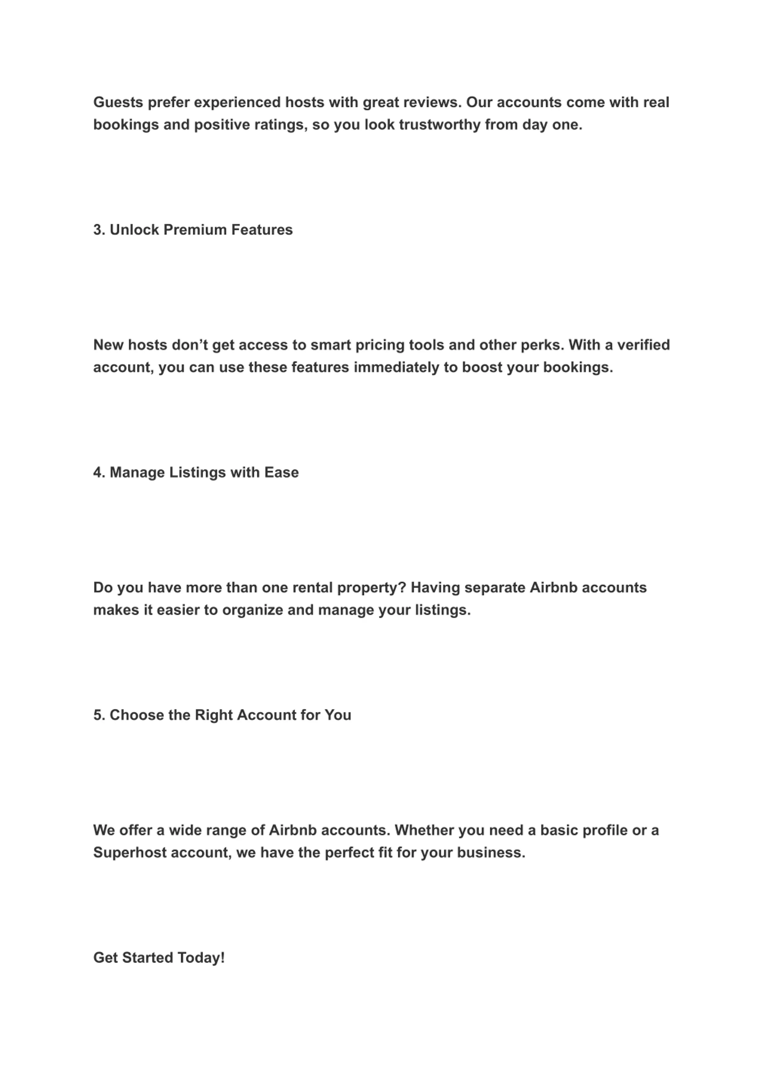 Guests prefer experienced hosts with great reviews. Our accounts come with real bookings and positive ratings, so you look trustworthy from day one. 3. Unlock Premium Features New hosts don t get access to smart pricing tools and other perks. With a verified account, you can use these features immediately to boost your bookings. 4. Manage Listings with Ease Do you have more than one rental property? Having separate Airbnb accounts makes it easier to organize and manage your listings. 5. Choose the Right Account for You We offer a wide range of Airbnb accounts. Whether you need a basic profile or a Superhost account, we have the perfect fit for your business. Get Started Today!