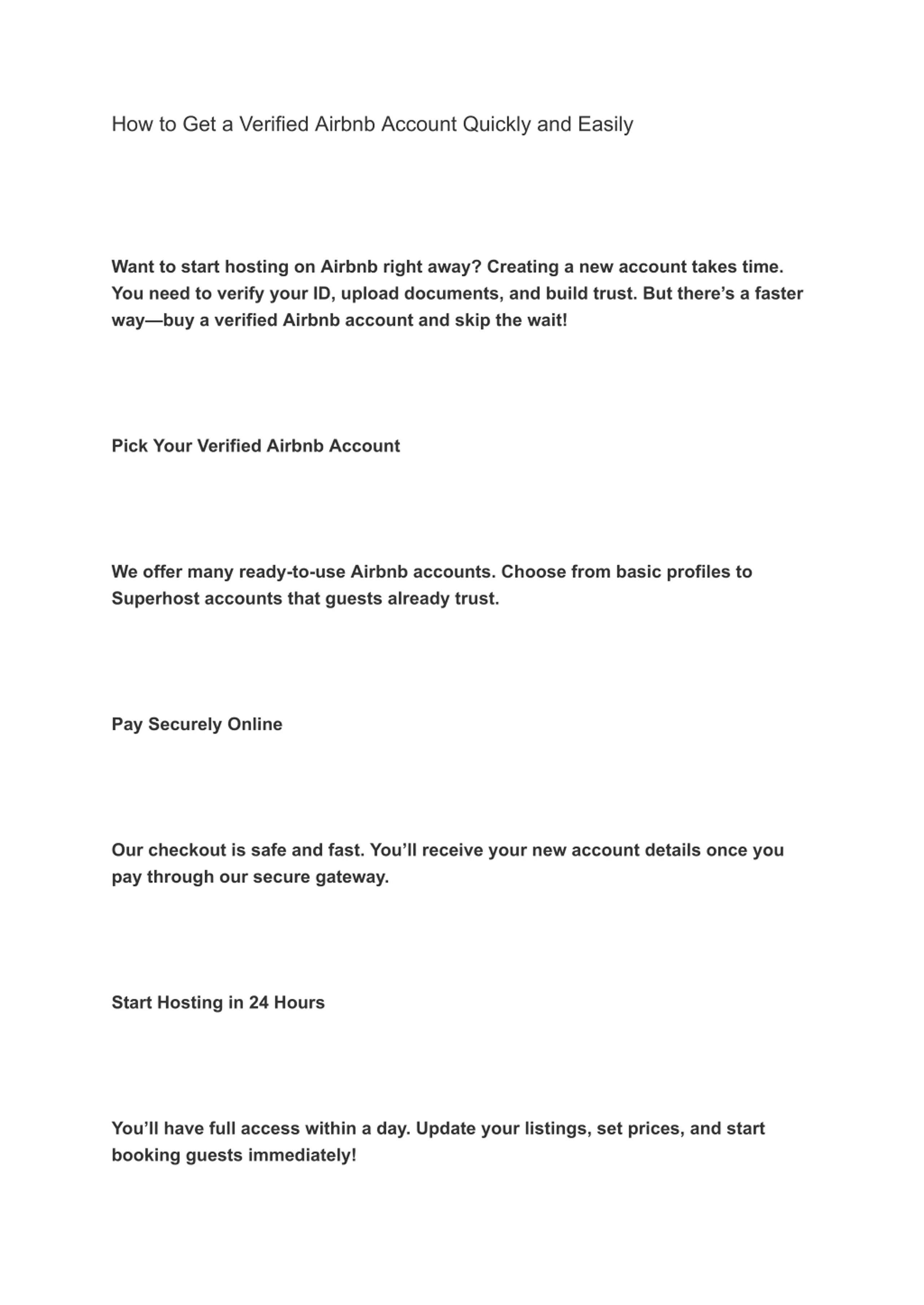 How to Get a Verified Airbnb Account Quickly and Easily Want to start hosting on Airbnb right away? Creating a new account takes time. You need to verify your ID, upload documents, and build trust. But there s a faster way buy a verified Airbnb account and skip the wait! Pick Your Verified Airbnb Account We offer many ready-to-use Airbnb accounts. Choose from basic profiles to Superhost accounts that guests already trust. Pay Securely Online Our checkout is safe and fast. You ll receive your new account details once you pay through our secure gateway. Start Hosting in 24 Hours You ll have full access within a day. Update your listings, set prices, and start booking guests immediately!