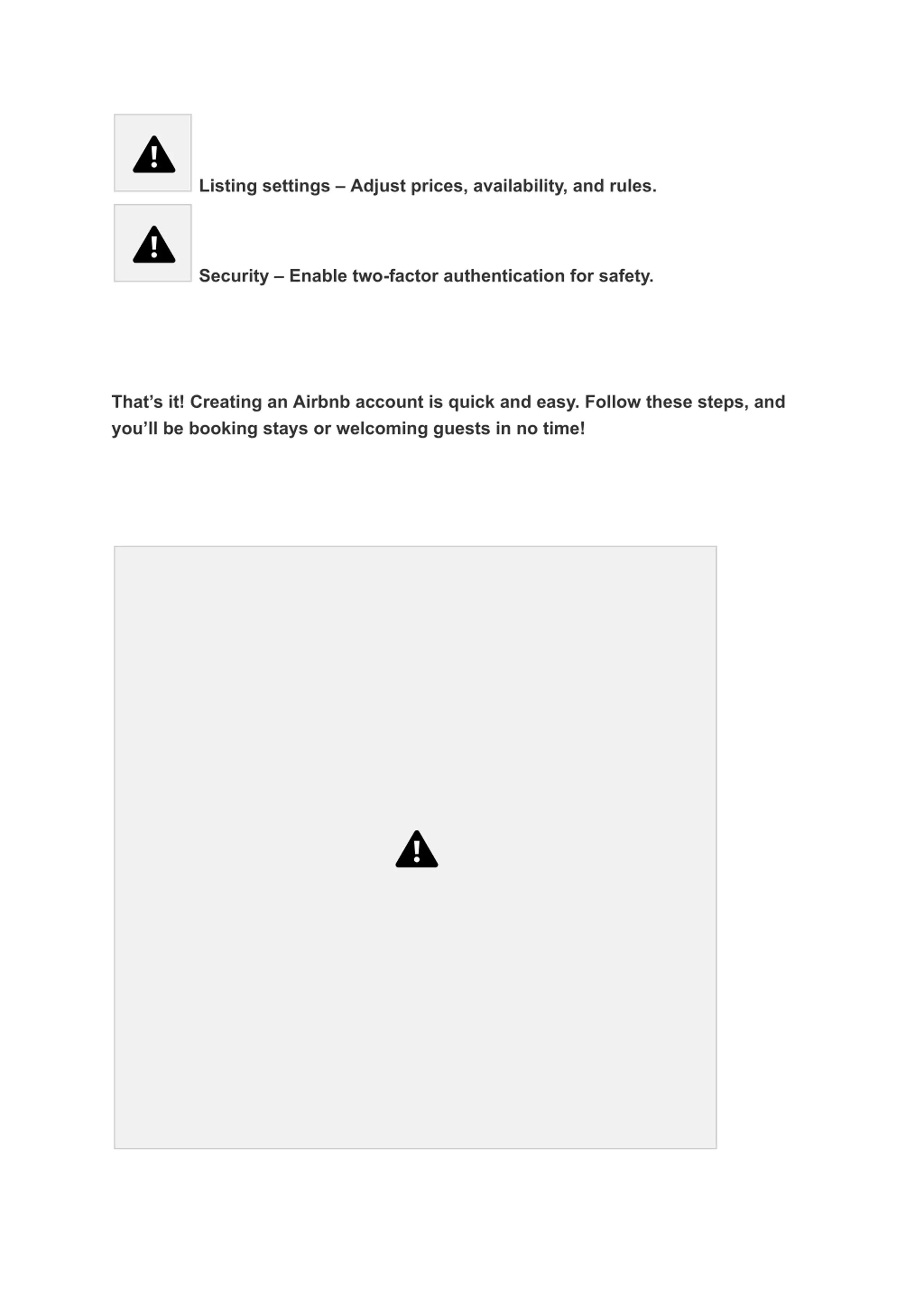 Listing settings Adjust prices, availability, and rules. Security Enable two-factor authentication for safety. That s it! Creating an Airbnb account is quick and easy. Follow these steps, and you ll be booking stays or welcoming guests in no time!
