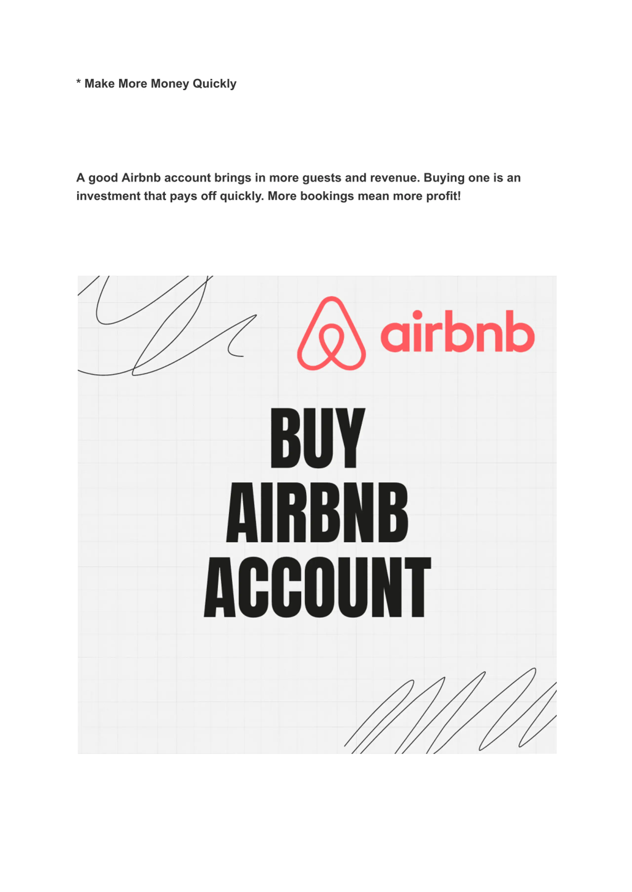 * Make More Money Quickly A good Airbnb account brings in more guests and revenue. Buying one is an investment that pays off quickly. More bookings mean more profit!