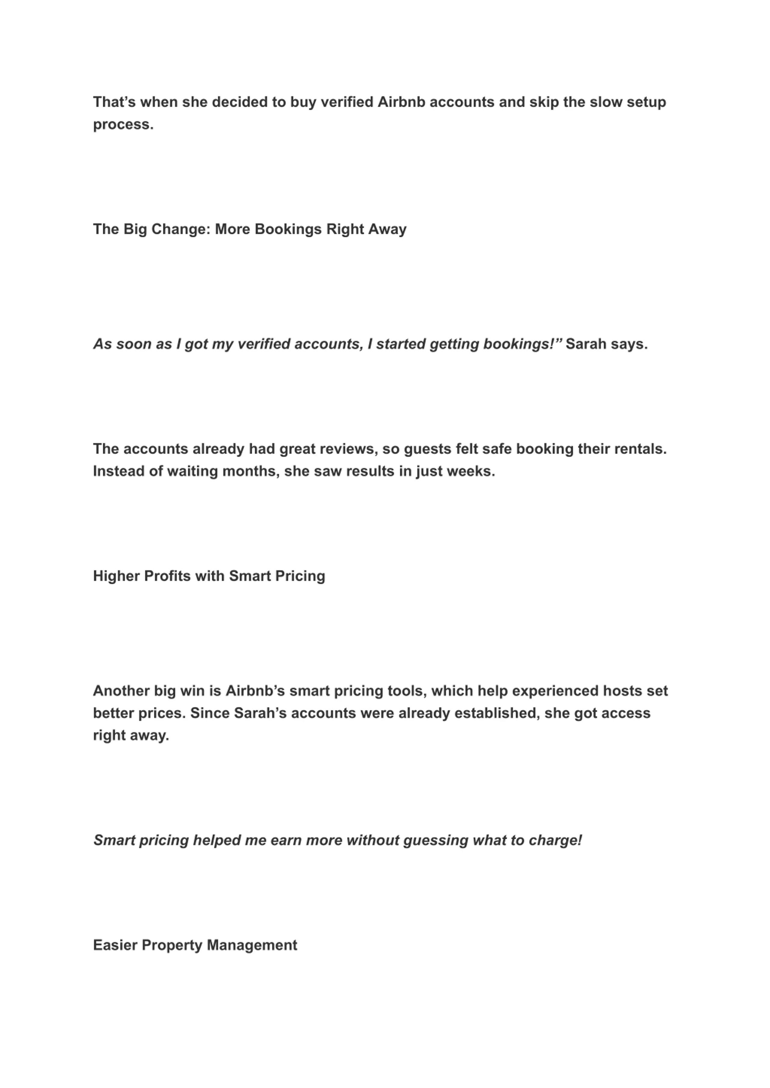 As her business grew, Sarah bought more verified accounts. This made it easy to organize her listings and track performance for each property. Managing my rentals became stress-free. I could adjust prices and check bookings in seconds! The Result: Fast Business Growth In just a year, Sarah s rental business tripled in size. I went from struggling with a few listings to running a successful Airbnb business. I couldn t have done it without verified accounts! Want to Grow Your Rental Business Faster? Sarah s story proves that buying verified Airbnb accounts can help you get more bookings, earn higher profits, and grow faster.