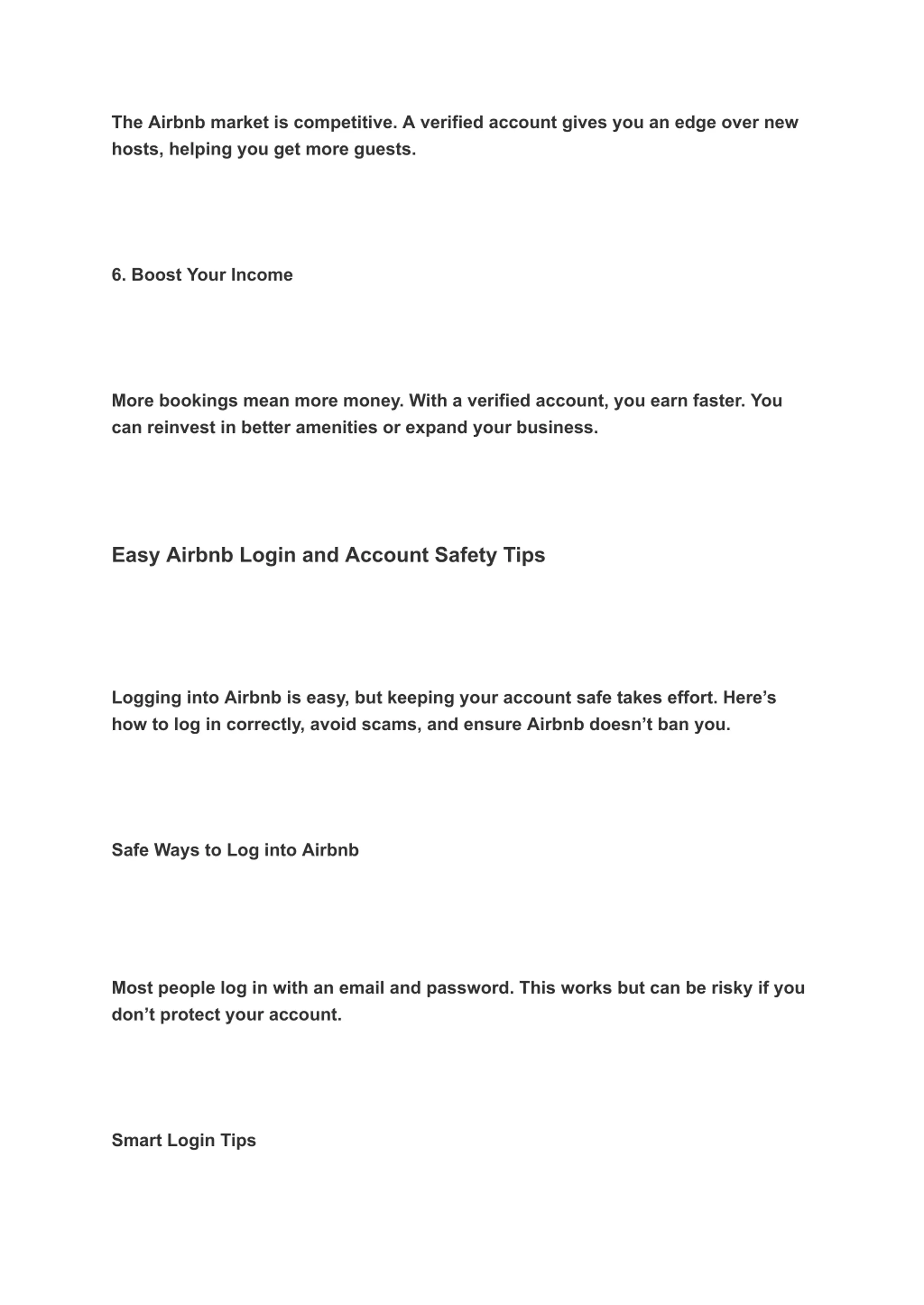 The Airbnb market is competitive. A verified account gives you an edge over new hosts, helping you get more guests. 6. Boost Your Income More bookings mean more money. With a verified account, you earn faster. You can reinvest in better amenities or expand your business. Easy Airbnb Login and Account Safety Tips Logging into Airbnb is easy, but keeping your account safe takes effort. Here s how to log in correctly, avoid scams, and ensure Airbnb doesn t ban you. Safe Ways to Log into Airbnb Most people log in with an email and password. This works but can be risky if you don t protect your account. Smart Login Tips