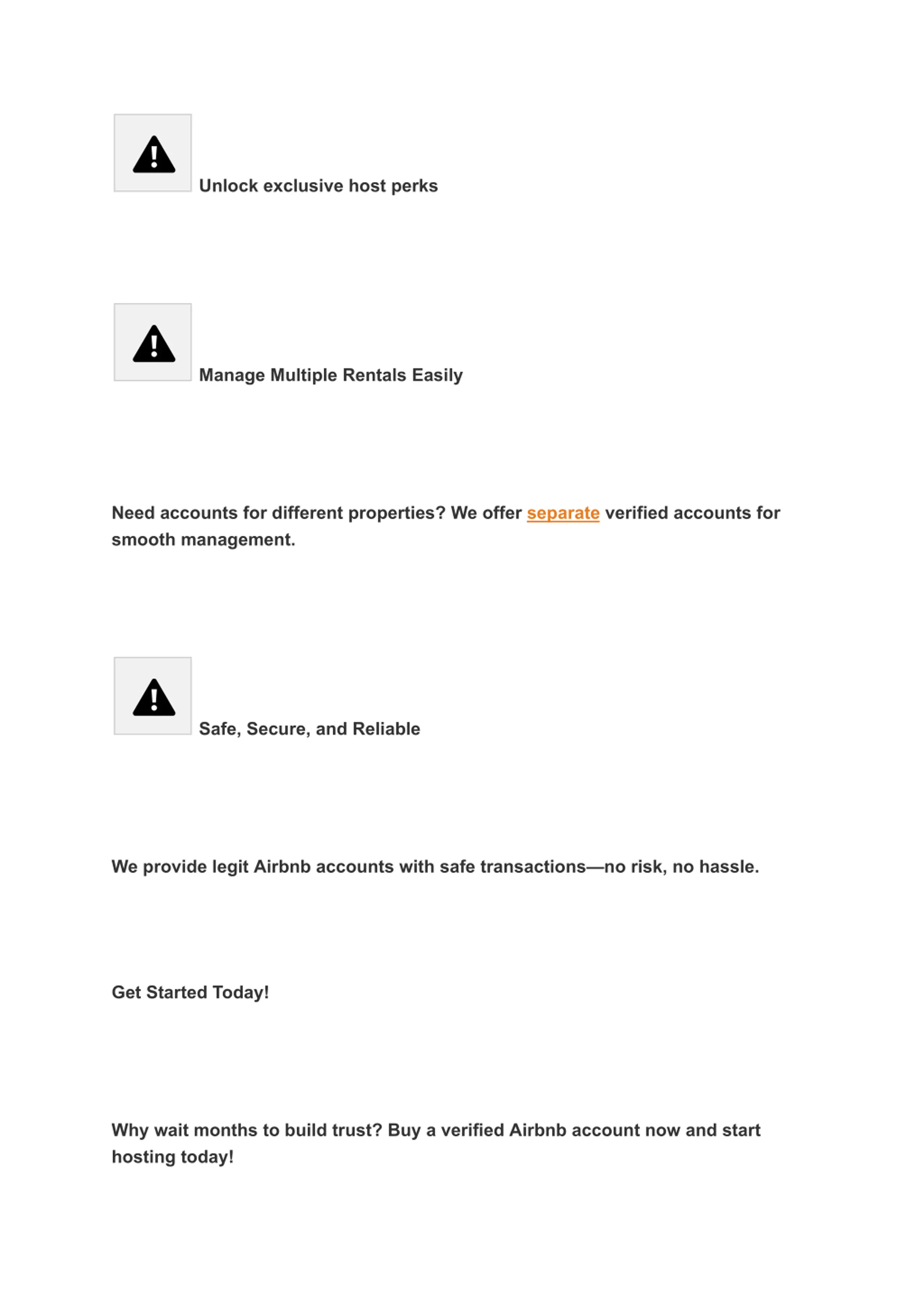 Creating a new Airbnb account takes time. You need to verify your identity and set up your listing. But once you purchase an account, all that work is done! You can start renting right away. * Get Instant Trust and Reviews New hosts struggle to get bookings because they have no reviews. Guests prefer hosts with good ratings. Buying an account with reviews gives you instant trust and more chances to get bookings. * Unlock Airbnb s Best Features Airbnb gives top hosts special features like instant booking and smart pricing. New accounts don t get these right away. But with a verified account, you can use these perks from day one. * Grow Your Business Faster Handling them on separate accounts can be easier if you own multiple rentals. Buying extra verified accounts helps you manage listings better and build a solid reputation.
