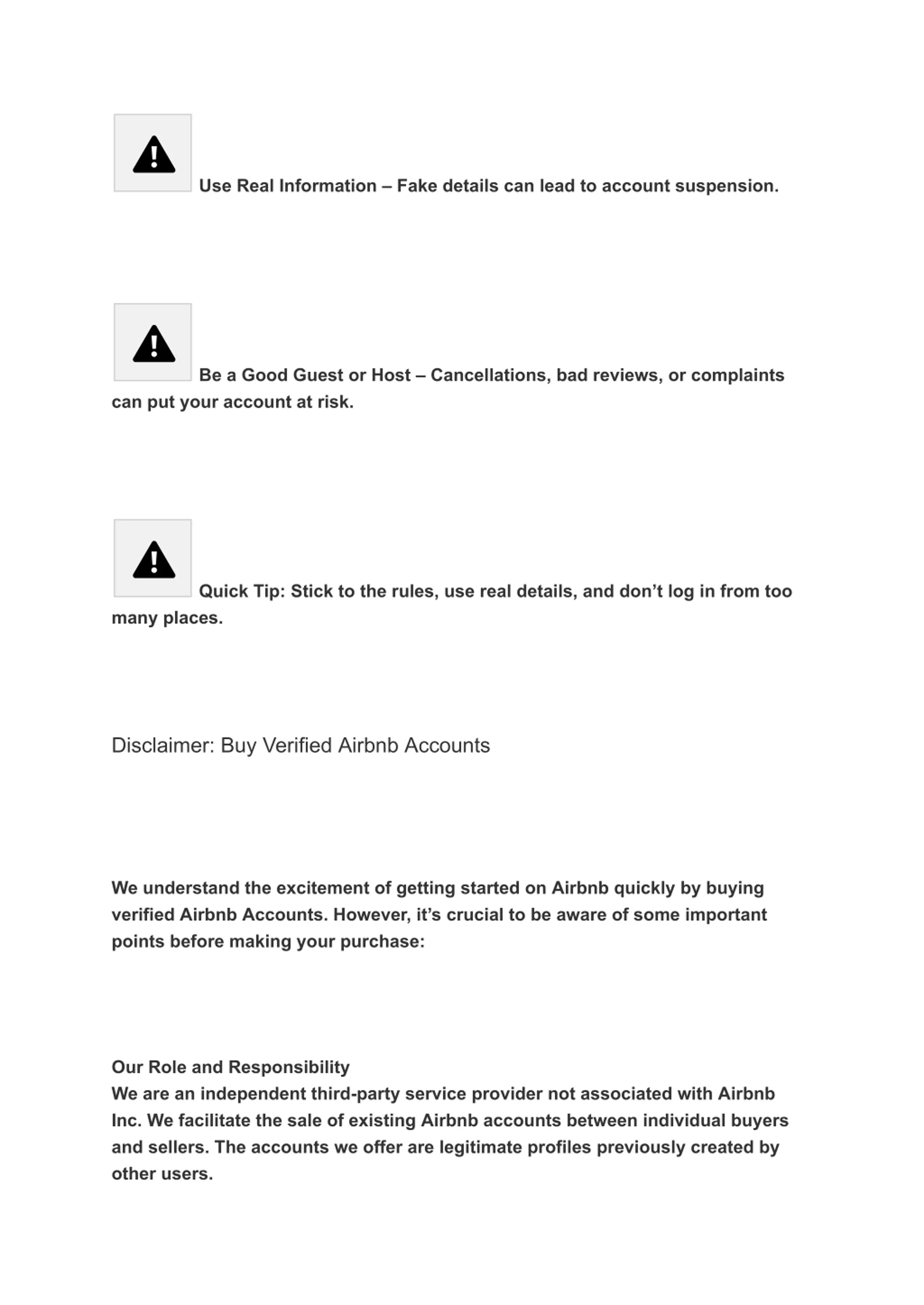 Use Real Information Fake details can lead to account suspension. Be a Good Guest or Host Cancellations, bad reviews, or complaints can put your account at risk. Quick Tip: Stick to the rules, use real details, and don t log in from too many places. Disclaimer: Buy Verified Airbnb Accounts We understand the excitement of getting started on Airbnb quickly by buying verified Airbnb Accounts. However, it s crucial to be aware of some important points before making your purchase: Our Role and Responsibility We are an independent third-party service provider not associated with Airbnb Inc. We facilitate the sale of existing Airbnb accounts between individual buyers and sellers. The accounts we offer are legitimate profiles previously created by other users.