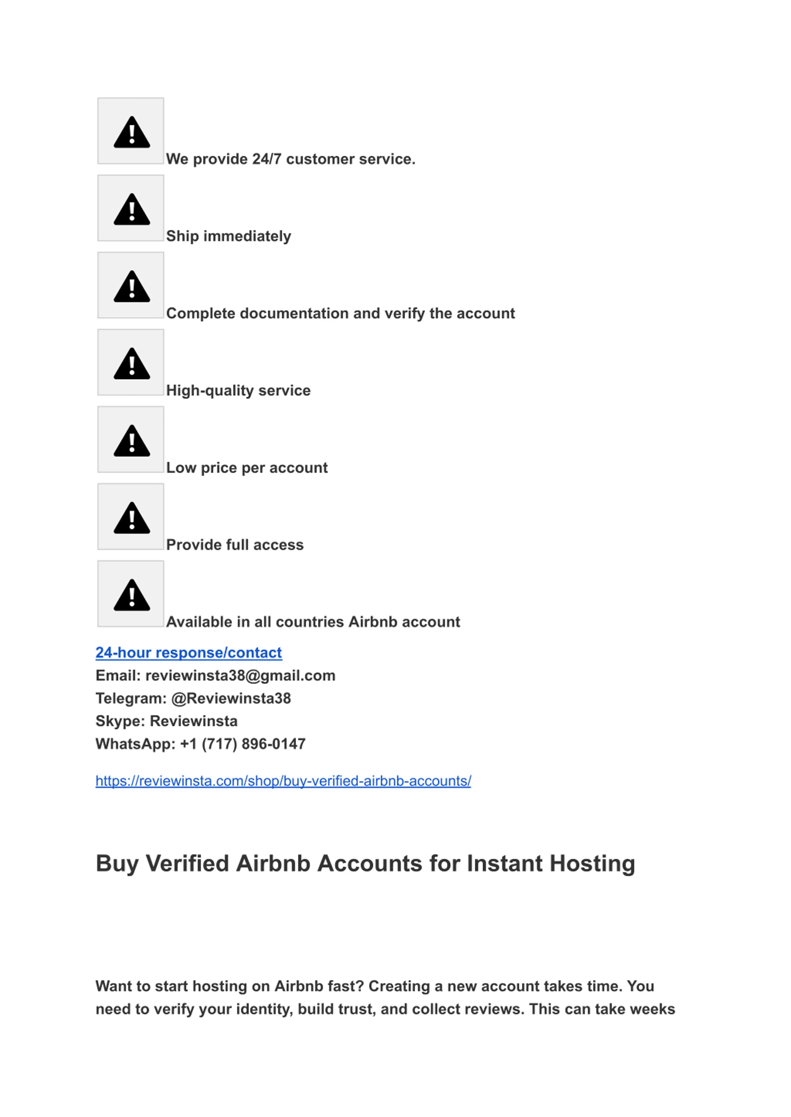 We provide 24/7 customer service. Ship immediately Complete documentation and verify the account High-quality service Low price per account Provide full access Available in all countries Airbnb account 24-hour response/contact Email: reviewinsta38@gmail.com Telegram: @Reviewinsta38 Skype: Reviewinsta WhatsApp: +1 (717) 896-0147 https://reviewinsta.com/shop/buy-verified-airbnb-accounts/ Buy Verified Airbnb Accounts for Instant Hosting Want to start hosting on Airbnb fast? Creating a new account takes time. You need to verify your identity, build trust, and collect reviews. This can take weeks