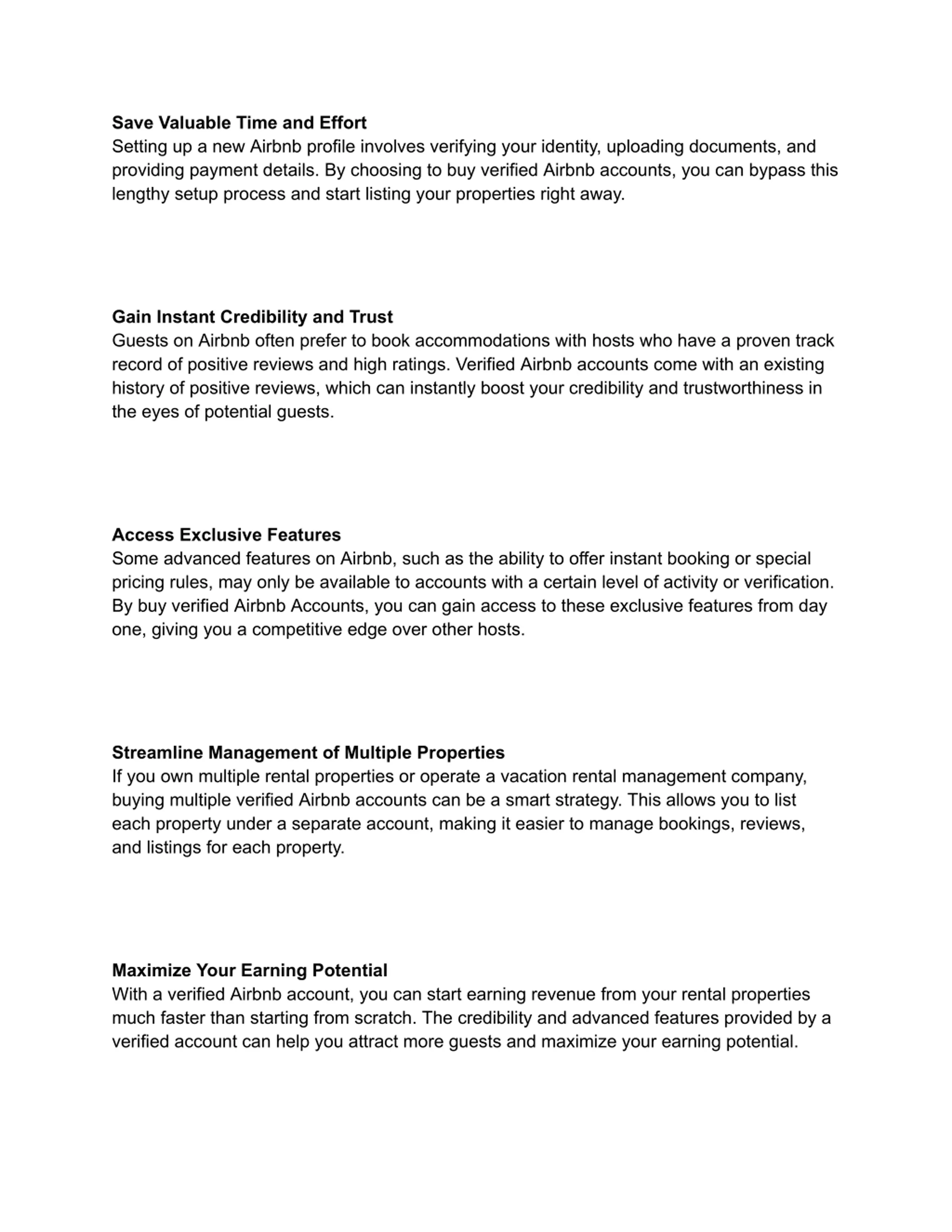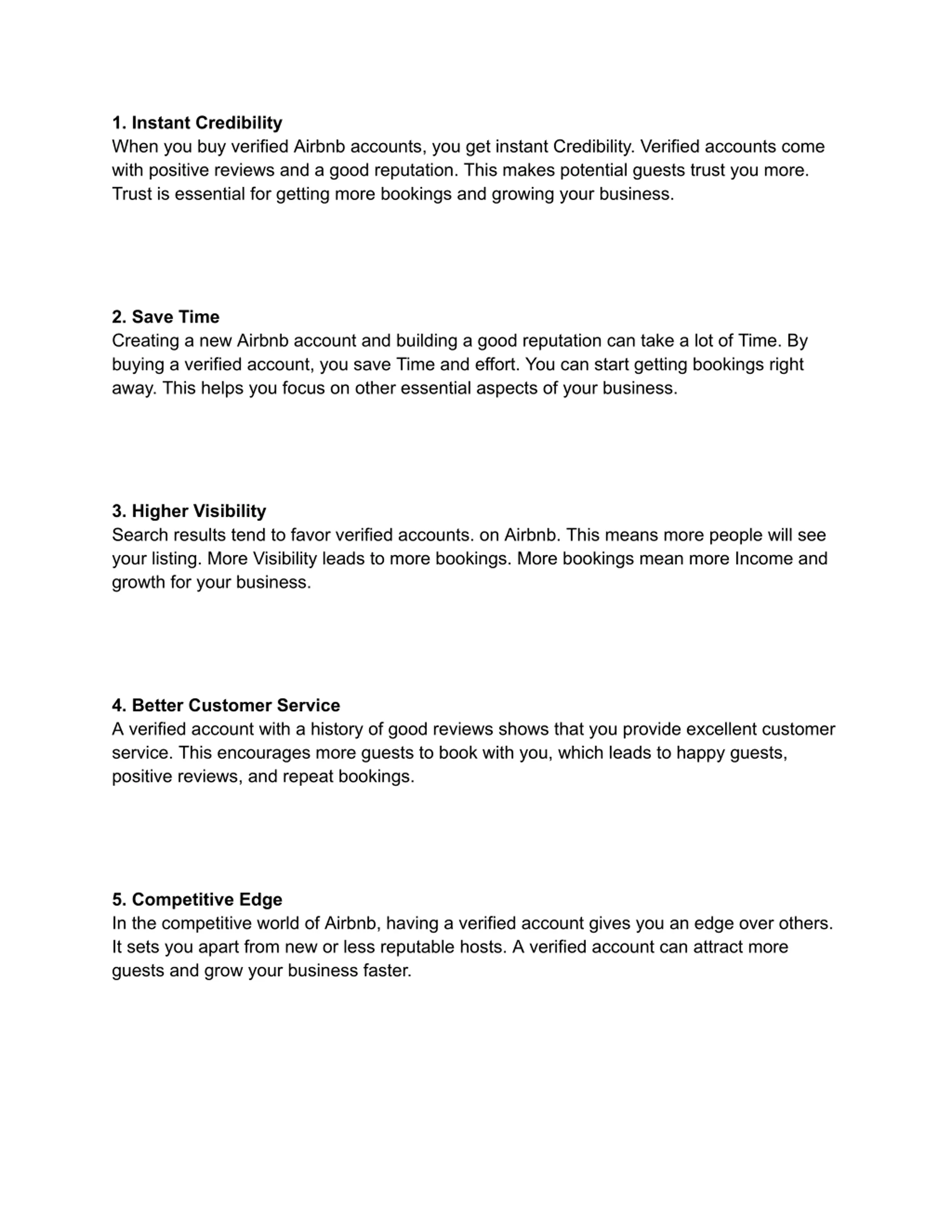 1. Instant Credibility When you buy verified Airbnb accounts, you get instant Credibility. Verified accounts come with positive reviews and a good reputation. This makes potential guests trust you more. Trust is essential for getting more bookings and growing your business. 2. Save Time Creating a new Airbnb account and building a good reputation can take a lot of Time. By buying a verified account, you save Time and effort. You can start getting bookings right away. This helps you focus on other essential aspects of your business. 3. Higher Visibility Search results tend to favor verified accounts. on Airbnb. This means more people will see your listing. More Visibility leads to more bookings. More bookings mean more Income and growth for your business. 4. Better Customer Service A verified account with a history of good reviews shows that you provide excellent customer service. This encourages more guests to book with you, which leads to happy guests, positive reviews, and repeat bookings. 5. Competitive Edge In the competitive world of Airbnb, having a verified account gives you an edge over others. It sets you apart from new or less reputable hosts. A verified account can attract more guests and grow your business faster.