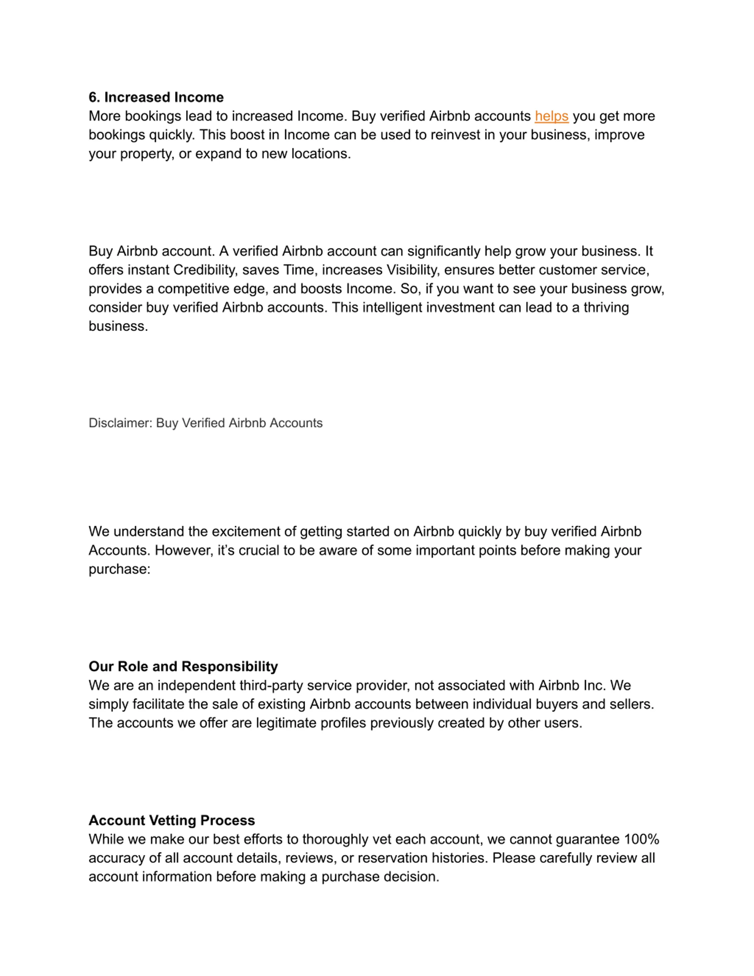 6. Increased Income More bookings lead to increased Income. Buy verified Airbnb accounts helps you get more bookings quickly. This boost in Income can be used to reinvest in your business, improve your property, or expand to new locations. Buy Airbnb account. A verified Airbnb account can significantly help grow your business. It offers instant Credibility, saves Time, increases Visibility, ensures better customer service, provides a competitive edge, and boosts Income. So, if you want to see your business grow, consider buy verified Airbnb accounts. This intelligent investment can lead to a thriving business. Disclaimer: Buy Verified Airbnb Accounts We understand the excitement of getting started on Airbnb quickly by buy verified Airbnb Accounts. However, it s crucial to be aware of some important points before making your purchase: Our Role and Responsibility We are an independent third-party service provider, not associated with Airbnb Inc. We simply facilitate the sale of existing Airbnb accounts between individual buyers and sellers. The accounts we offer are legitimate profiles previously created by other users. Account Vetting Process While we make our best efforts to thoroughly vet each account, we cannot guarantee 100% accuracy of all account details, reviews, or reservation histories. Please carefully review all account information before making a purchase decision.