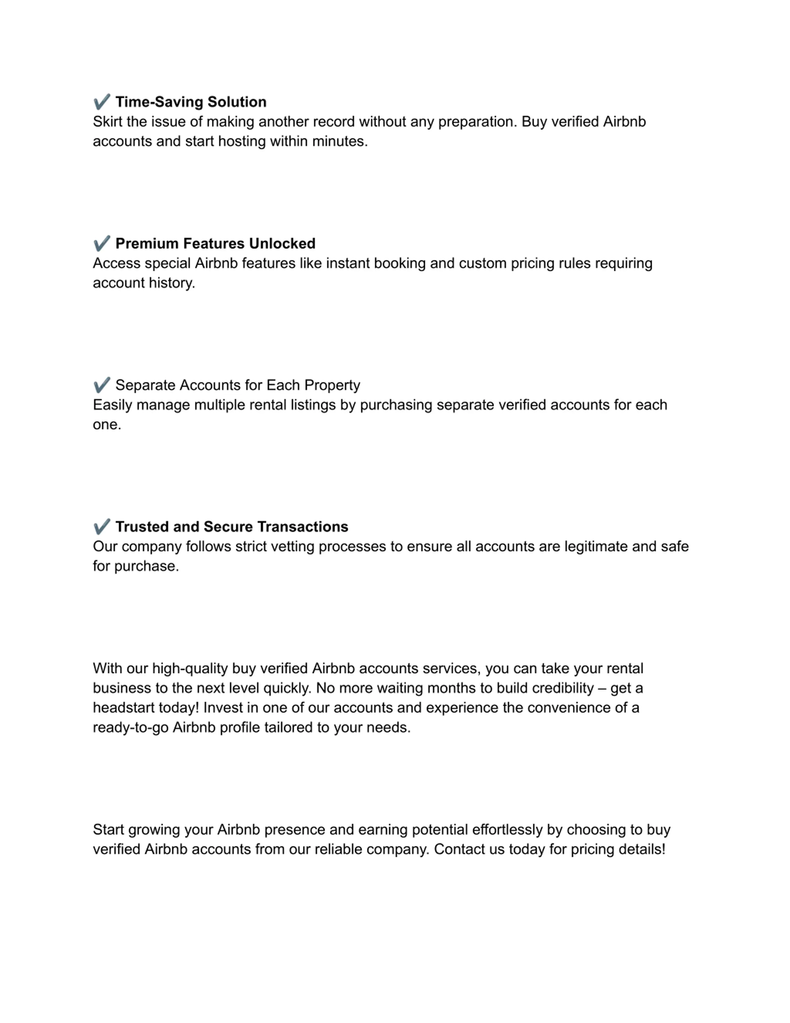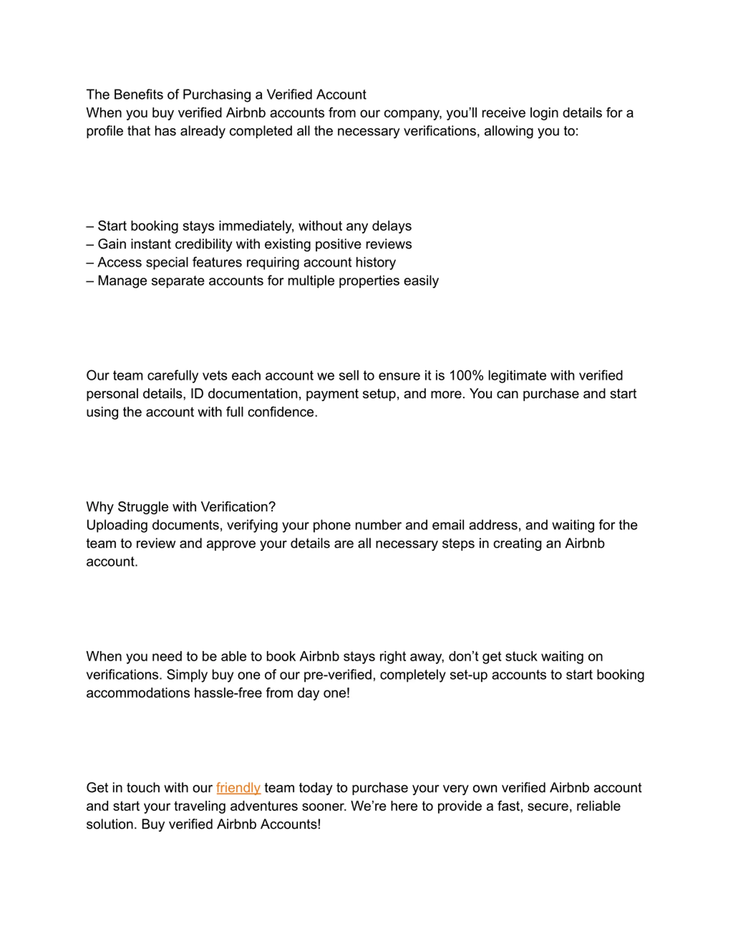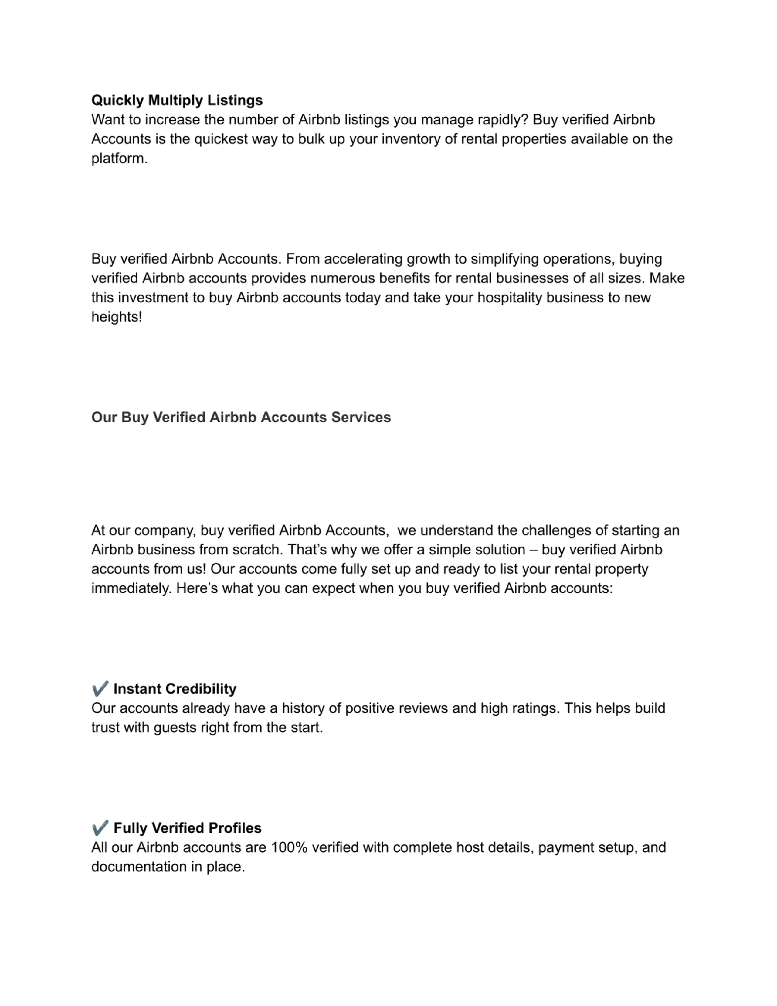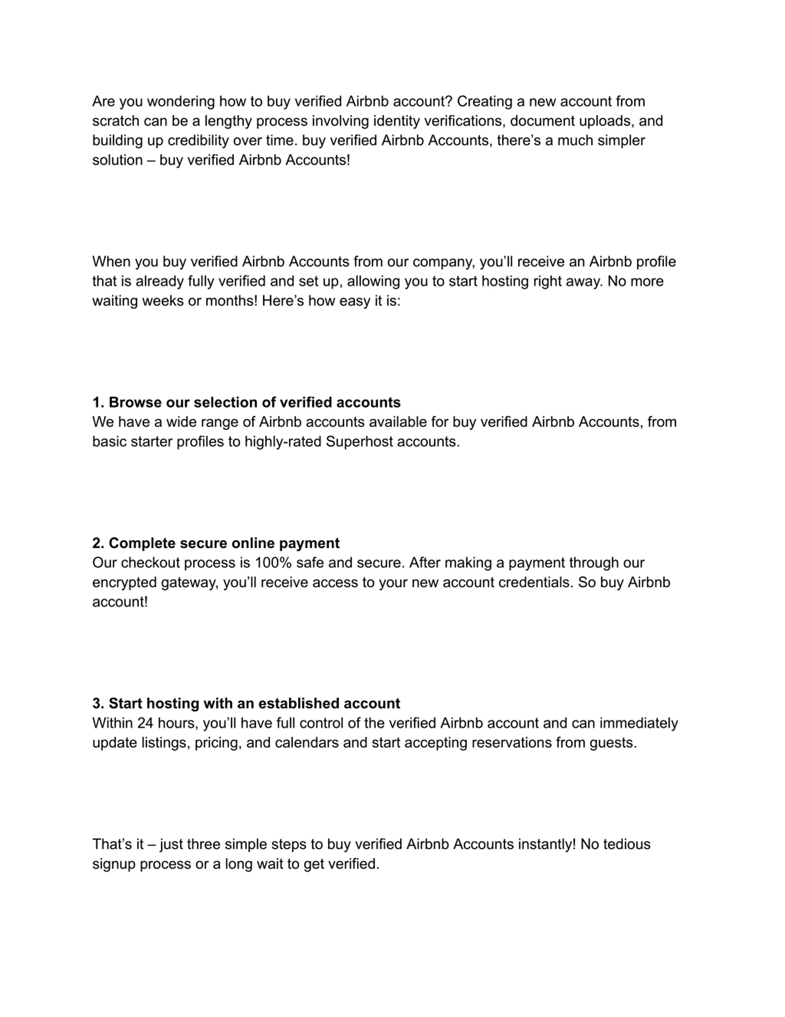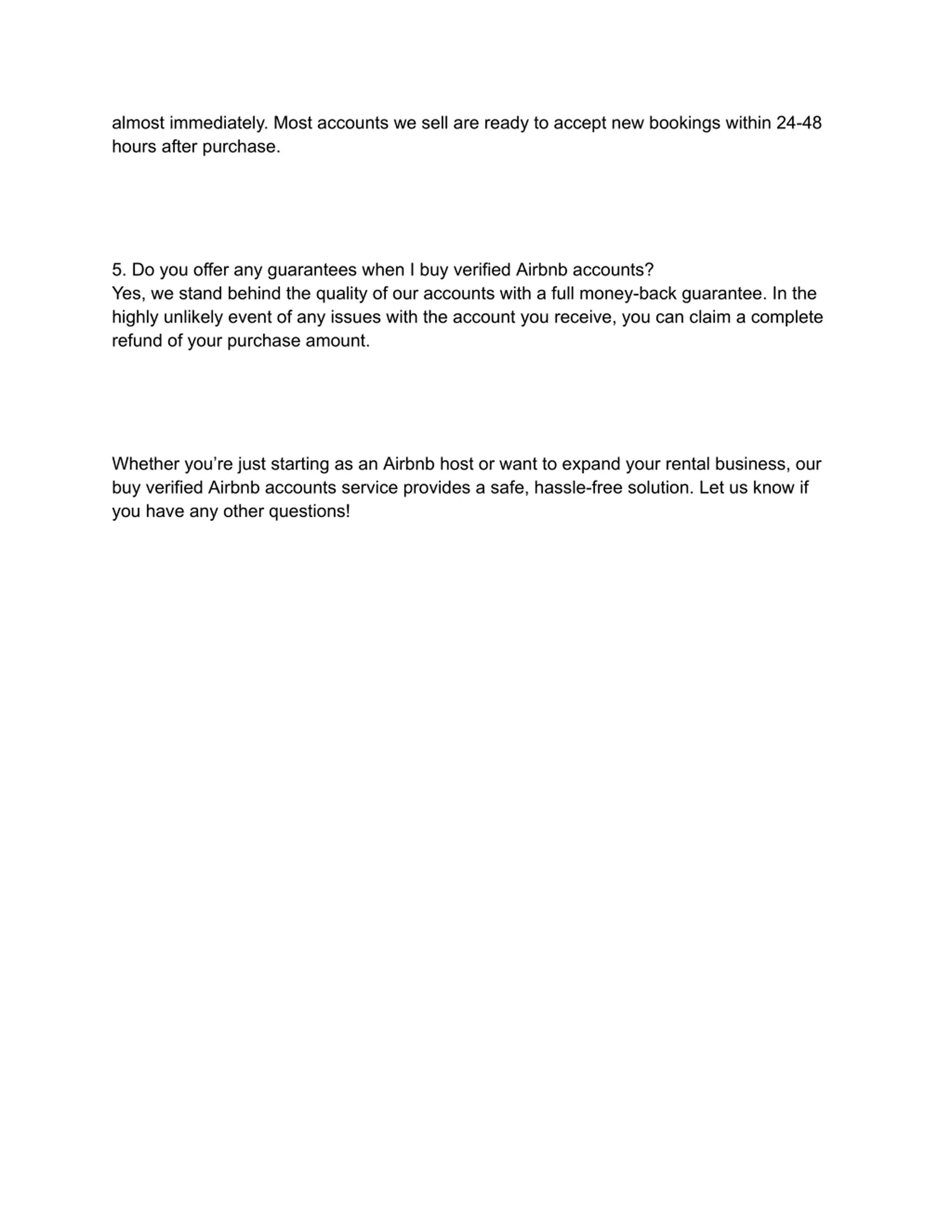 almost immediately. Most accounts we sell are ready to accept new bookings within 24-48 hours after purchase. 5. Do you offer any guarantees when I buy verified Airbnb accounts? Yes, we stand behind the quality of our accounts with a full money-back guarantee. In the highly unlikely event of any issues with the account you receive, you can claim a complete refund of your purchase amount. Whether you re just starting as an Airbnb host or want to expand your rental business, our buy verified Airbnb accounts service provides a safe, hassle-free solution. Let us know if you have any other questions!