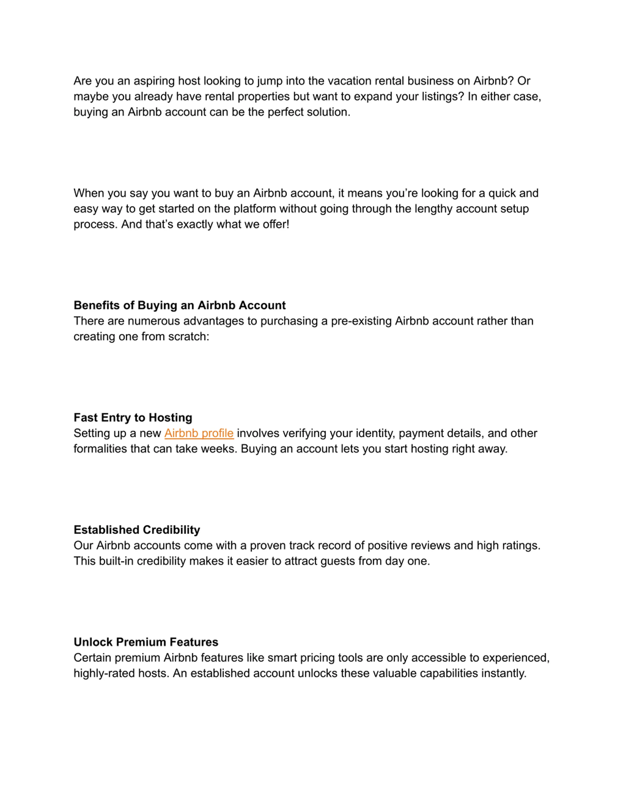 Are you an aspiring host looking to jump into the vacation rental business on Airbnb? Or maybe you already have rental properties but want to expand your listings? In either case, buying an Airbnb account can be the perfect solution. When you say you want to buy an Airbnb account, it means you re looking for a quick and easy way to get started on the platform without going through the lengthy account setup process. And that s exactly what we offer! Benefits of Buying an Airbnb Account There are numerous advantages to purchasing a pre-existing Airbnb account rather than creating one from scratch: Fast Entry to Hosting Setting up a new Airbnb profile involves verifying your identity, payment details, and other formalities that can take weeks. Buying an account lets you start hosting right away. Established Credibility Our Airbnb accounts come with a proven track record of positive reviews and high ratings. This built-in credibility makes it easier to attract guests from day one. Unlock Premium Features Certain premium Airbnb features like smart pricing tools are only accessible to experienced, highly-rated hosts. An established account unlocks these valuable capabilities instantly.