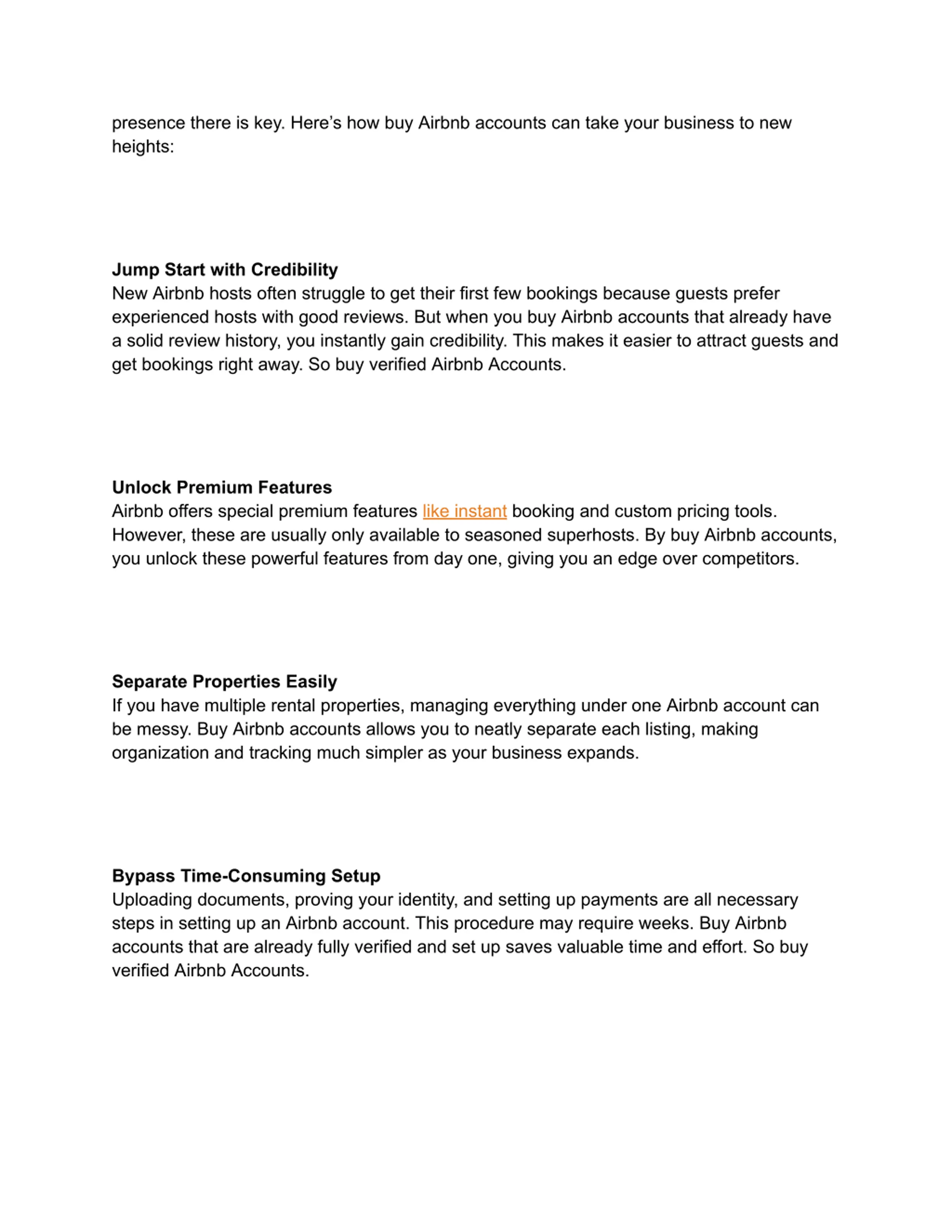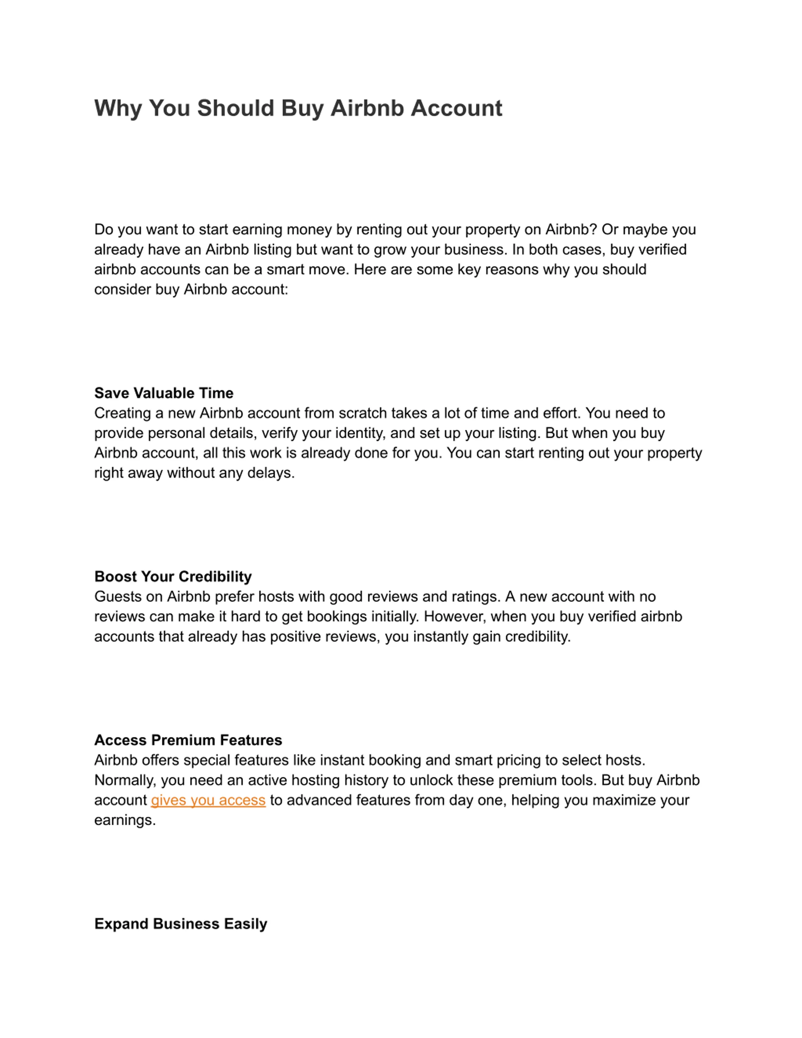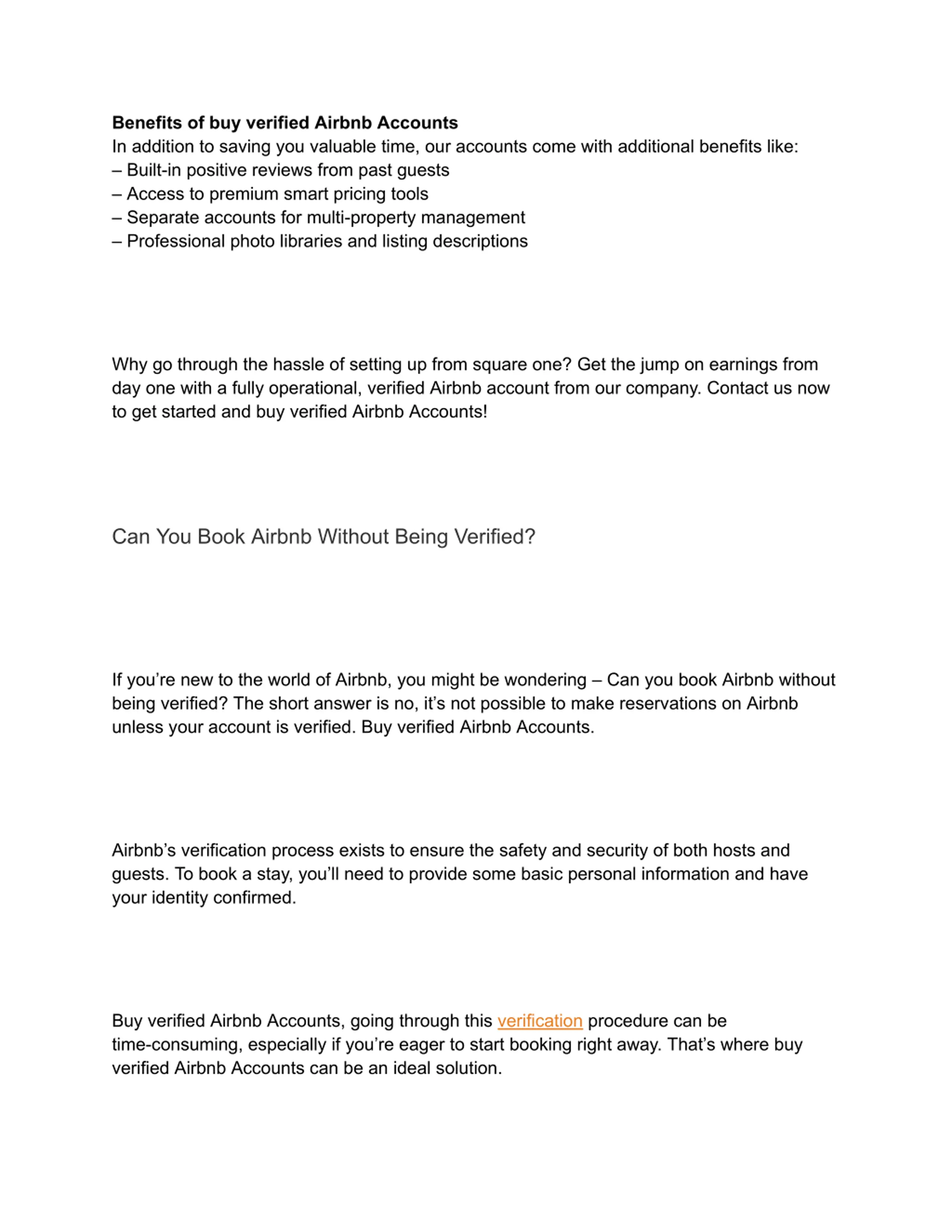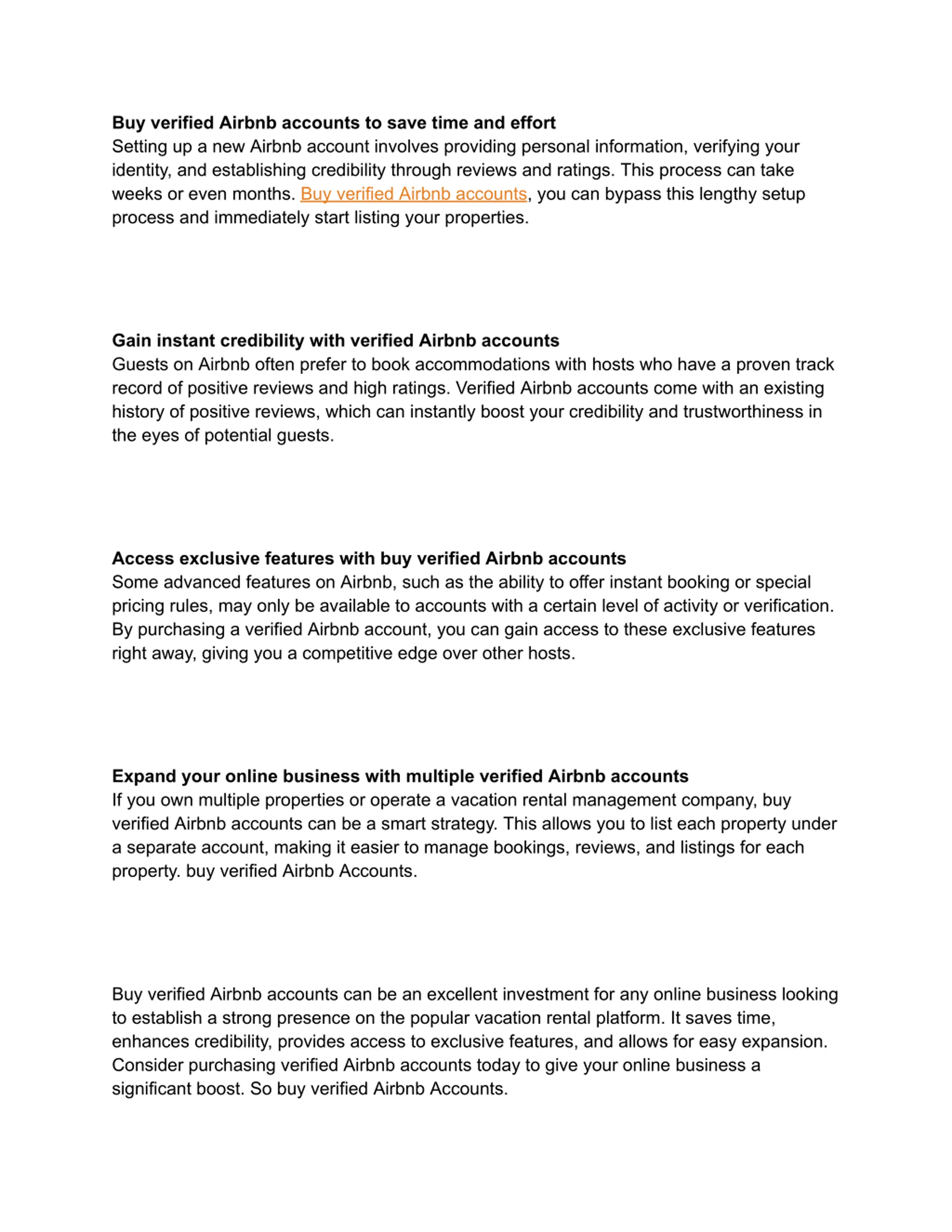 presence there is key. Heres how buy Airbnb accounts can take your business to new heights: Jump Start with Credibility New Airbnb hosts often struggle to get their first few bookings because guests prefer experienced hosts with good reviews. But when you buy Airbnb accounts that already have a solid review history, you instantly gain credibility. This makes it easier to attract guests and get bookings right away. So buy verified Airbnb Accounts. Unlock Premium Features Airbnb offers special premium features like instant booking and custom pricing tools. However, these are usually only available to seasoned superhosts. By buy Airbnb accounts, you unlock these powerful features from day one, giving you an edge over competitors. Separate Properties Easily If you have multiple rental properties, managing everything under one Airbnb account can be messy. Buy Airbnb accounts allows you to neatly separate each listing, making organization and tracking much simpler as your business expands. Bypass Time-Consuming Setup Uploading documents, proving your identity, and setting up payments are all necessary steps in setting up an Airbnb account. This procedure may require weeks. Buy Airbnb accounts that are already fully verified and set up saves valuable time and effort. So buy verified Airbnb Accounts.