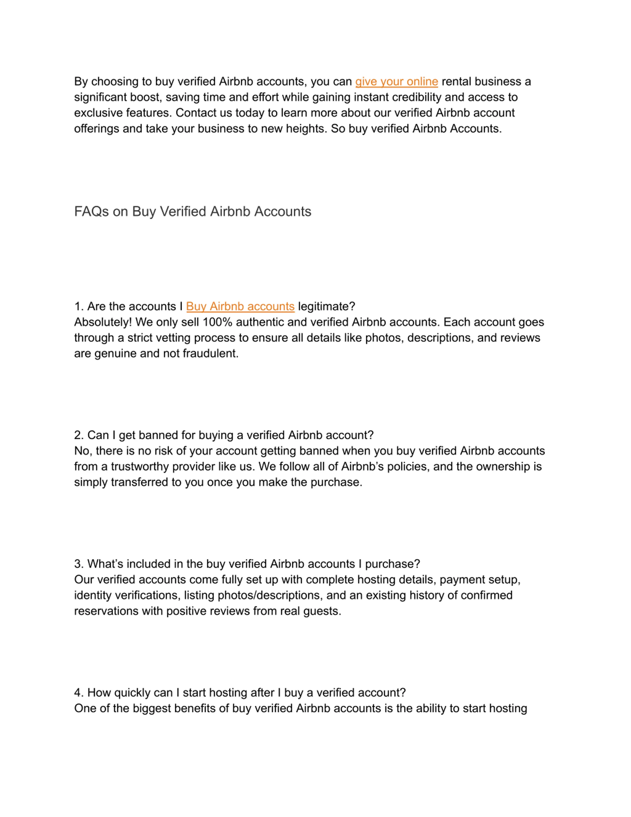 By choosing to buy verified Airbnb accounts, you can give your online rental business a significant boost, saving time and effort while gaining instant credibility and access to exclusive features. Contact us today to learn more about our verified Airbnb account offerings and take your business to new heights. So buy verified Airbnb Accounts. FAQs on Buy Verified Airbnb Accounts 1. Are the accounts I Buy Airbnb accounts legitimate? Absolutely! We only sell 100% authentic and verified Airbnb accounts. Each account goes through a strict vetting process to ensure all details like photos, descriptions, and reviews are genuine and not fraudulent. 2. Can I get banned for buying a verified Airbnb account? No, there is no risk of your account getting banned when you buy verified Airbnb accounts from a trustworthy provider like us. We follow all of Airbnb s policies, and the ownership is simply transferred to you once you make the purchase. 3. What s included in the buy verified Airbnb accounts I purchase? Our verified accounts come fully set up with complete hosting details, payment setup, identity verifications, listing photos/descriptions, and an existing history of confirmed reservations with positive reviews from real guests. 4. How quickly can I start hosting after I buy a verified account? One of the biggest benefits of buy verified Airbnb accounts is the ability to start hosting