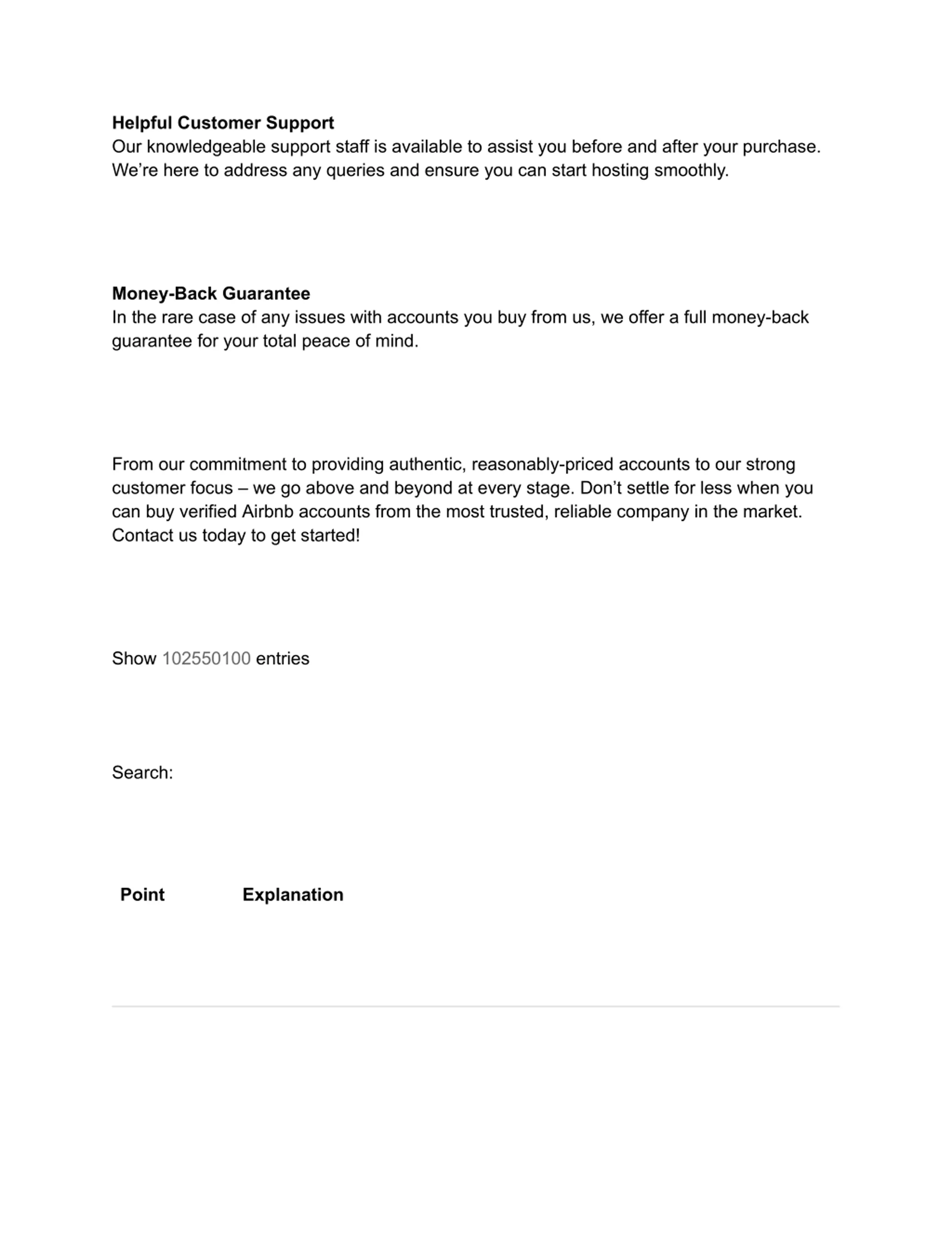 Helpful Customer Support Our knowledgeable support staff is available to assist you before and after your purchase. We re here to address any queries and ensure you can start hosting smoothly. Money-Back Guarantee In the rare case of any issues with accounts you buy from us, we offer a full money-back guarantee for your total peace of mind. From our commitment to providing authentic, reasonably-priced accounts to our strong customer focus we go above and beyond at every stage. Don t settle for less when you can buy verified Airbnb accounts from the most trusted, reliable company in the market. Contact us today to get started! Show 102550100 entries Search: Point Explanation