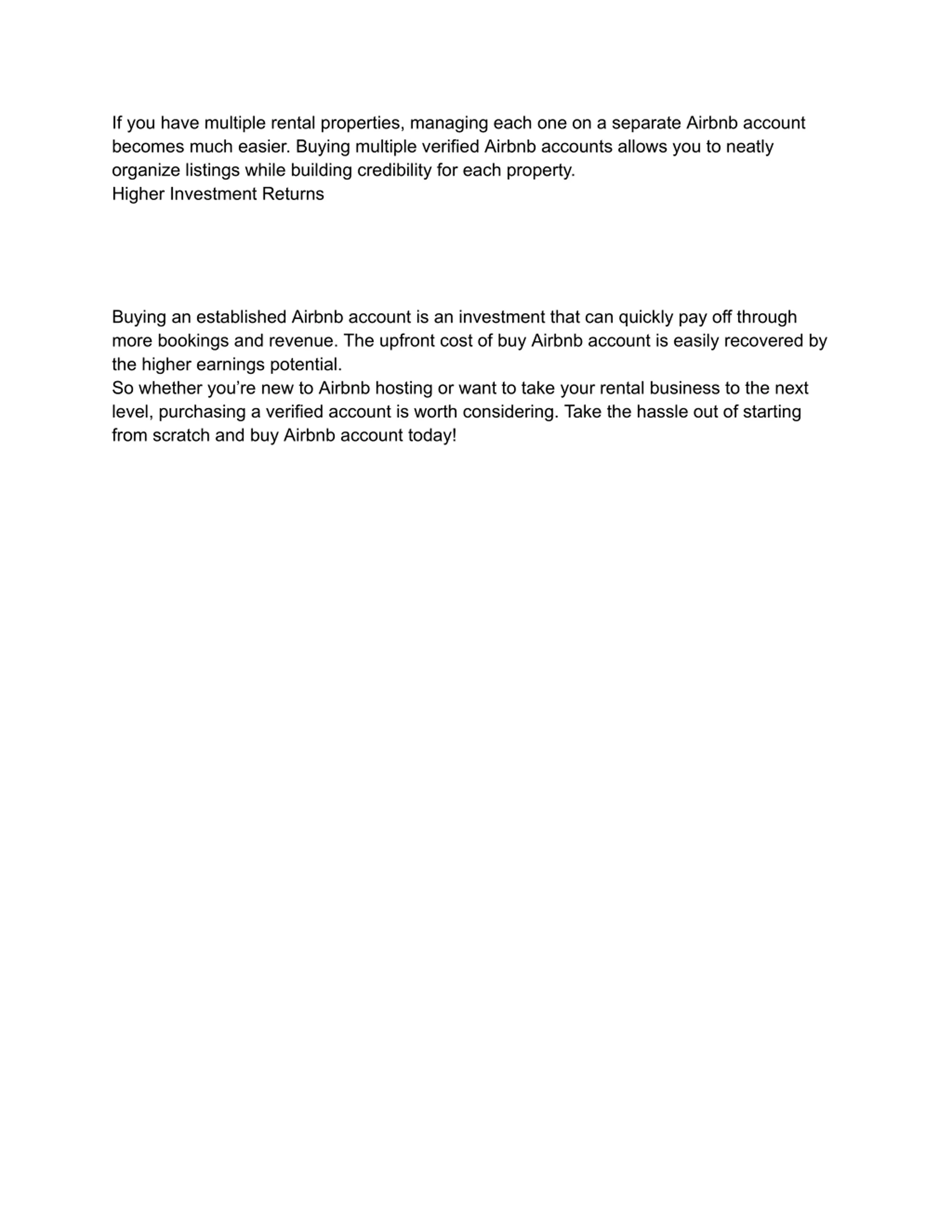 If you have multiple rental properties, managing each one on a separate Airbnb account becomes much easier. Buying multiple verified Airbnb accounts allows you to neatly organize listings while building credibility for each property. Higher Investment Returns Buying an established Airbnb account is an investment that can quickly pay off through more bookings and revenue. The upfront cost of buy Airbnb account is easily recovered by the higher earnings potential. So whether you re new to Airbnb hosting or want to take your rental business to the next level, purchasing a verified account is worth considering. Take the hassle out of starting from scratch and buy Airbnb account today!