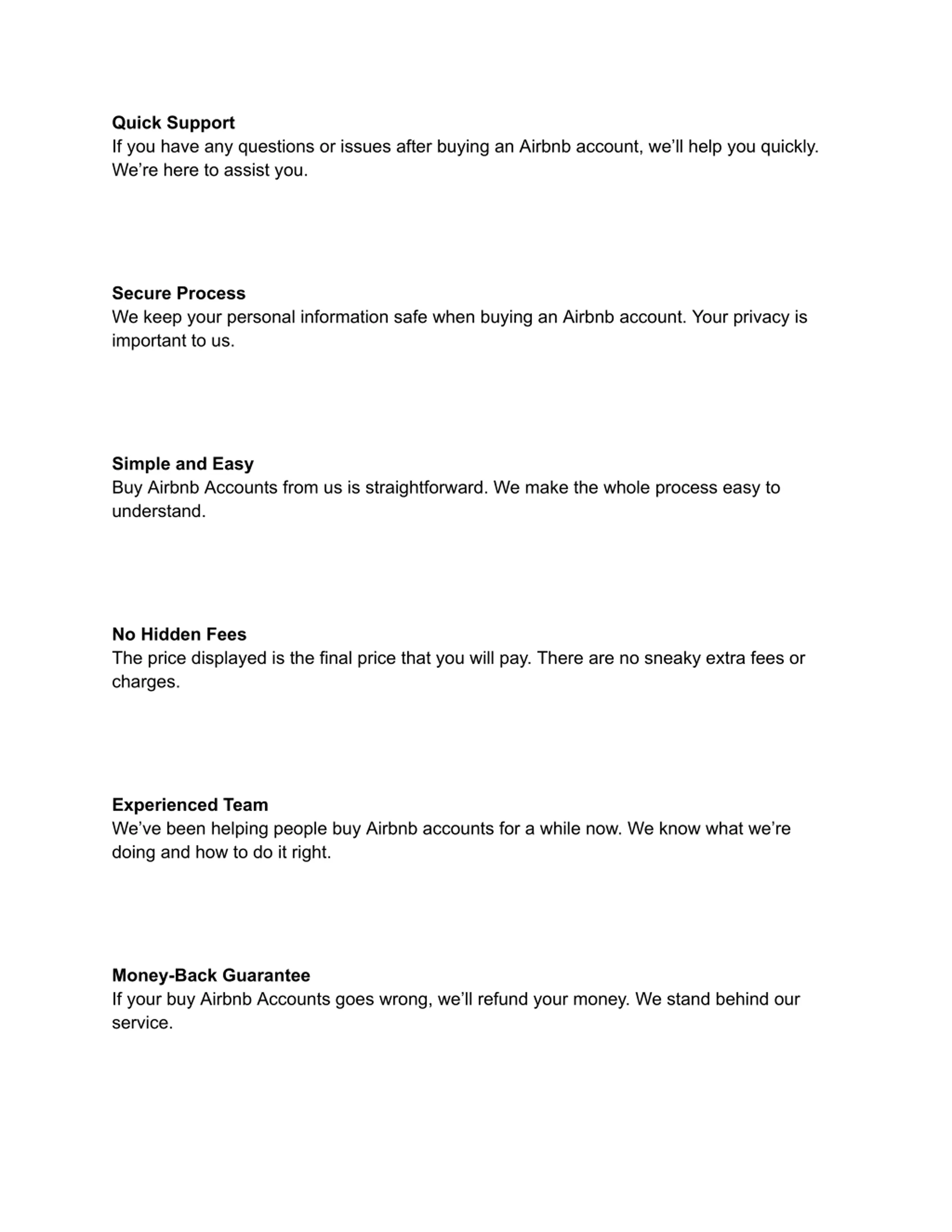 Quick Support If you have any questions or issues after buying an Airbnb account, we ll help you quickly. We re here to assist you. Secure Process We keep your personal information safe when buying an Airbnb account. Your privacy is important to us. Simple and Easy Buy Airbnb Accounts from us is straightforward. We make the whole process easy to understand. No Hidden Fees The price displayed is the final price that you will pay. There are no sneaky extra fees or charges. Experienced Team We ve been helping people buy Airbnb accounts for a while now. We know what we re doing and how to do it right. Money-Back Guarantee If your buy Airbnb Accounts goes wrong, we ll refund your money. We stand behind our service.