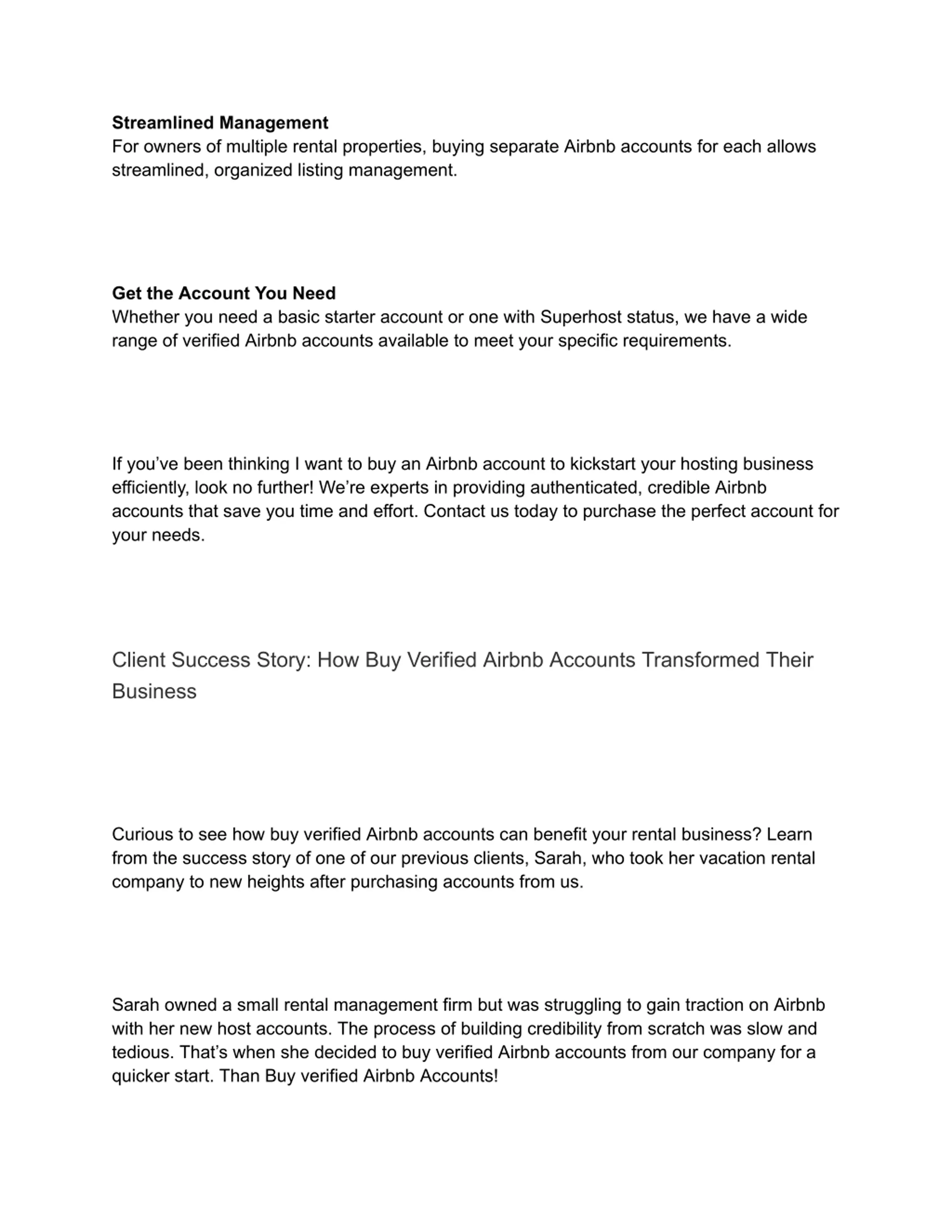 Streamlined Management For owners of multiple rental properties, buying separate Airbnb accounts for each allows streamlined, organized listing management. Get the Account You Need Whether you need a basic starter account or one with Superhost status, we have a wide range of verified Airbnb accounts available to meet your specific requirements. If you ve been thinking I want to buy an Airbnb account to kickstart your hosting business efficiently, look no further! We re experts in providing authenticated, credible Airbnb accounts that save you time and effort. Contact us today to purchase the perfect account for your needs. Client Success Story: How Buy Verified Airbnb Accounts Transformed Their Business Curious to see how buy verified Airbnb accounts can benefit your rental business? Learn from the success story of one of our previous clients, Sarah, who took her vacation rental company to new heights after purchasing accounts from us. Sarah owned a small rental management firm but was struggling to gain traction on Airbnb with her new host accounts. The process of building credibility from scratch was slow and tedious. That s when she decided to buy verified Airbnb accounts from our company for a quicker start. Than Buy verified Airbnb Accounts!