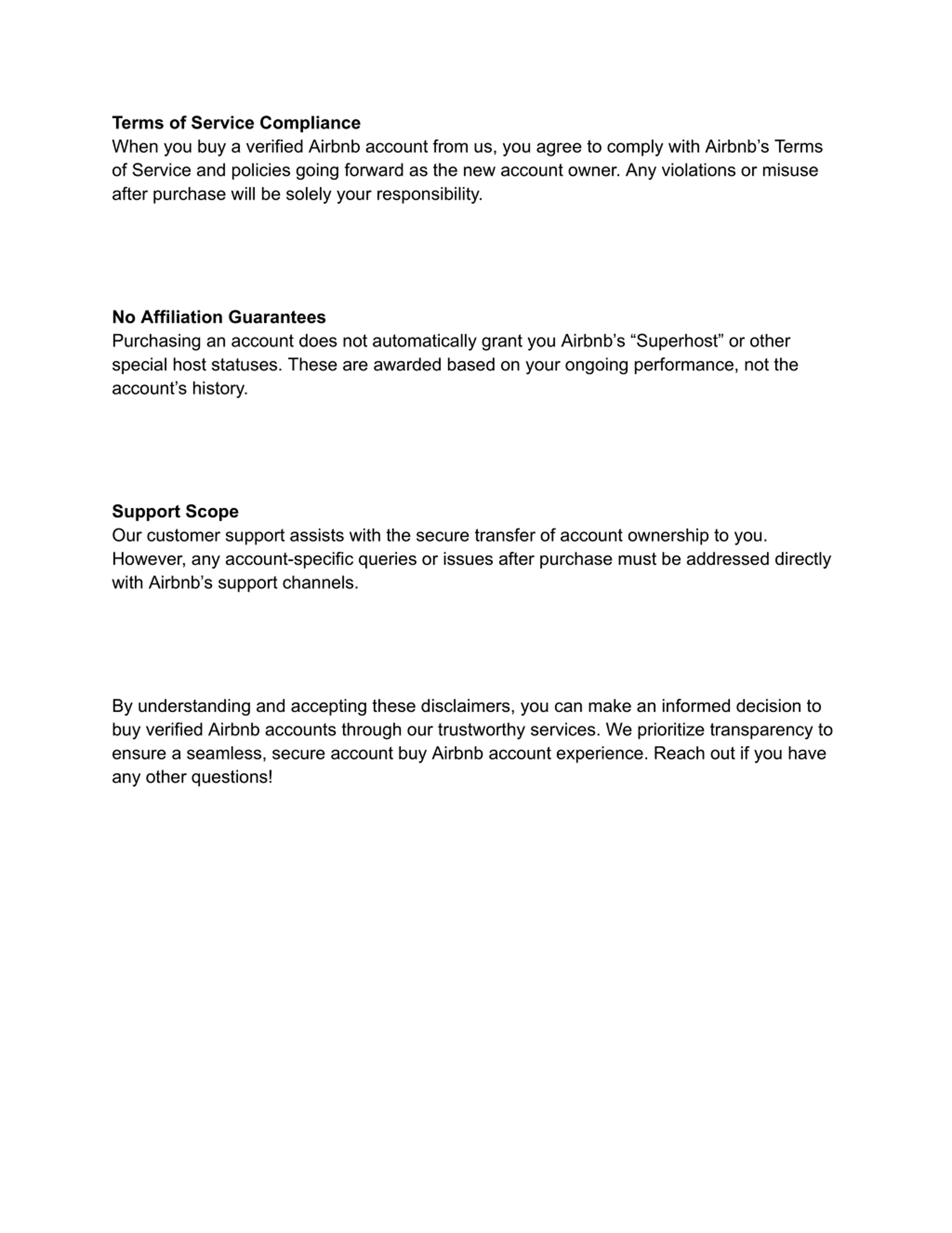 Terms of Service Compliance When you buy a verified Airbnb account from us, you agree to comply with Airbnb s Terms of Service and policies going forward as the new account owner. Any violations or misuse after purchase will be solely your responsibility. No Affiliation Guarantees Purchasing an account does not automatically grant you Airbnb s Superhost or other special host statuses. These are awarded based on your ongoing performance, not the account s history. Support Scope Our customer support assists with the secure transfer of account ownership to you. However, any account-specific queries or issues after purchase must be addressed directly with Airbnb s support channels. By understanding and accepting these disclaimers, you can make an informed decision to buy verified Airbnb accounts through our trustworthy services. We prioritize transparency to ensure a seamless, secure account buy Airbnb account experience. Reach out if you have any other questions!