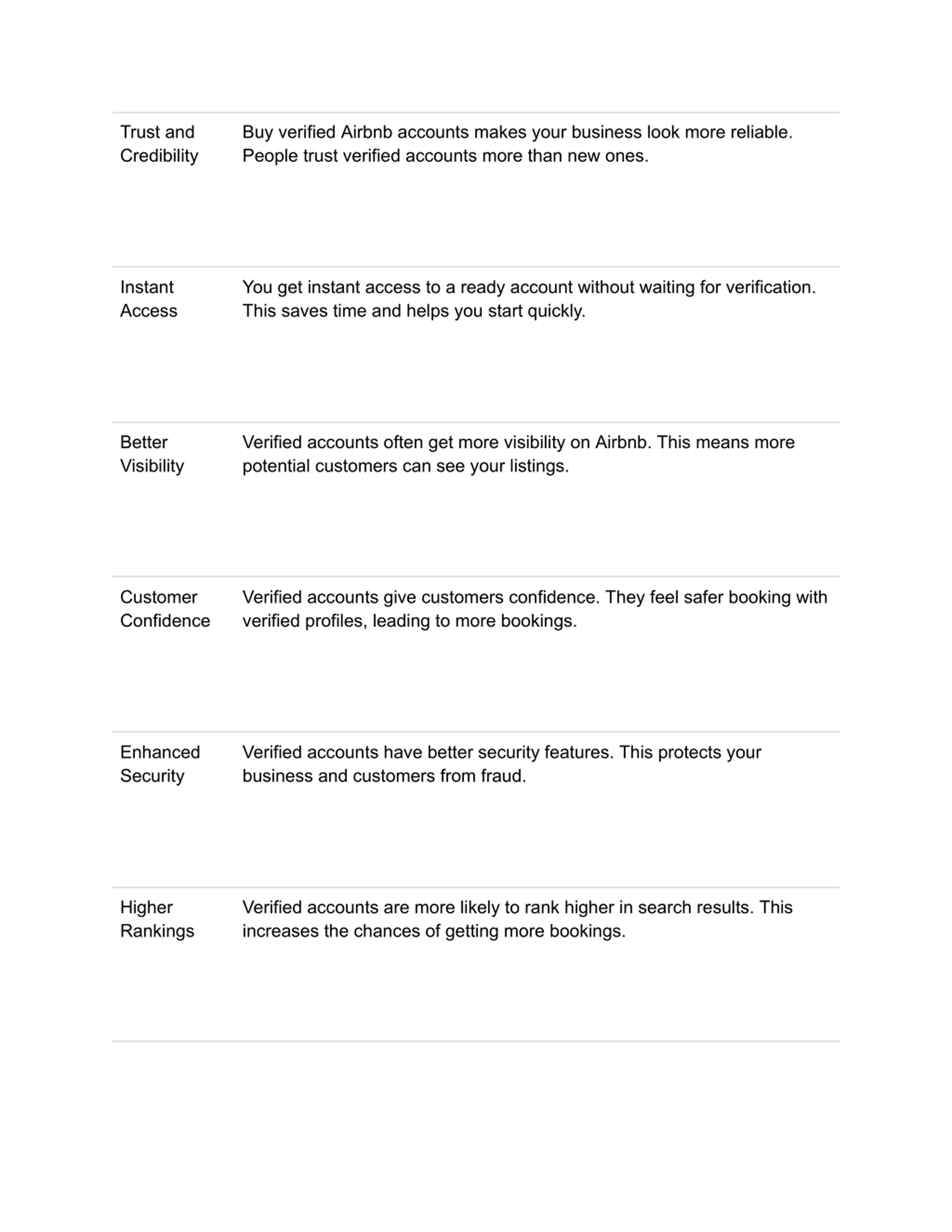 Trust and Credibility Buy verified Airbnb accounts makes your business look more reliable. People trust verified accounts more than new ones. Instant Access You get instant access to a ready account without waiting for verification. This saves time and helps you start quickly. Better Visibility Verified accounts often get more visibility on Airbnb. This means more potential customers can see your listings. Customer Confidence Verified accounts give customers confidence. They feel safer booking with verified profiles, leading to more bookings. Enhanced Security Verified accounts have better security features. This protects your business and customers from fraud. Higher Rankings Verified accounts are more likely to rank higher in search results. This increases the chances of getting more bookings.