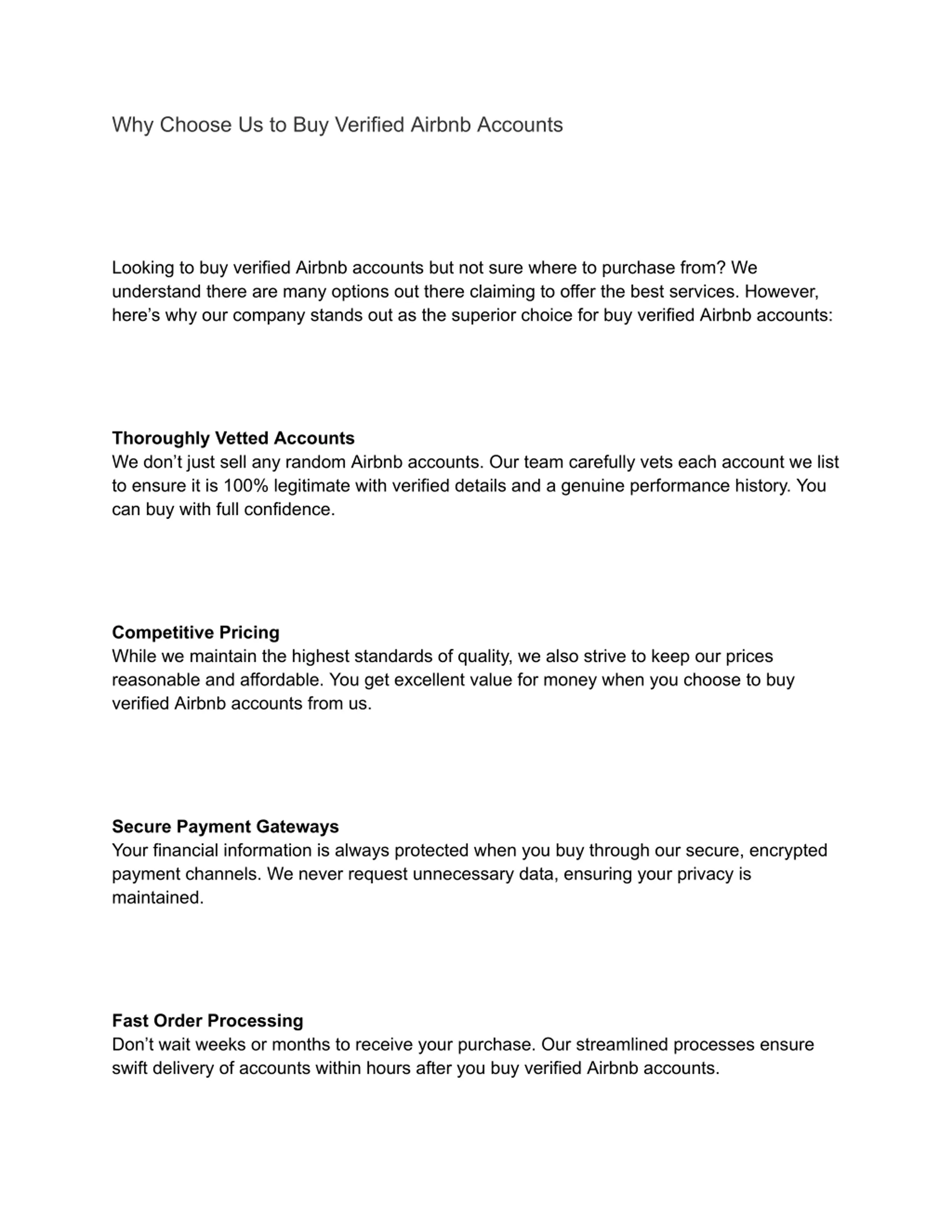 Why Choose Us to Buy Verified Airbnb Accounts Looking to buy verified Airbnb accounts but not sure where to purchase from? We understand there are many options out there claiming to offer the best services. However, here s why our company stands out as the superior choice for buy verified Airbnb accounts: Thoroughly Vetted Accounts We don t just sell any random Airbnb accounts. Our team carefully vets each account we list to ensure it is 100% legitimate with verified details and a genuine performance history. You can buy with full confidence. Competitive Pricing While we maintain the highest standards of quality, we also strive to keep our prices reasonable and affordable. You get excellent value for money when you choose to buy verified Airbnb accounts from us. Secure Payment Gateways Your financial information is always protected when you buy through our secure, encrypted payment channels. We never request unnecessary data, ensuring your privacy is maintained. Fast Order Processing Don t wait weeks or months to receive your purchase. Our streamlined processes ensure swift delivery of accounts within hours after you buy verified Airbnb accounts.
