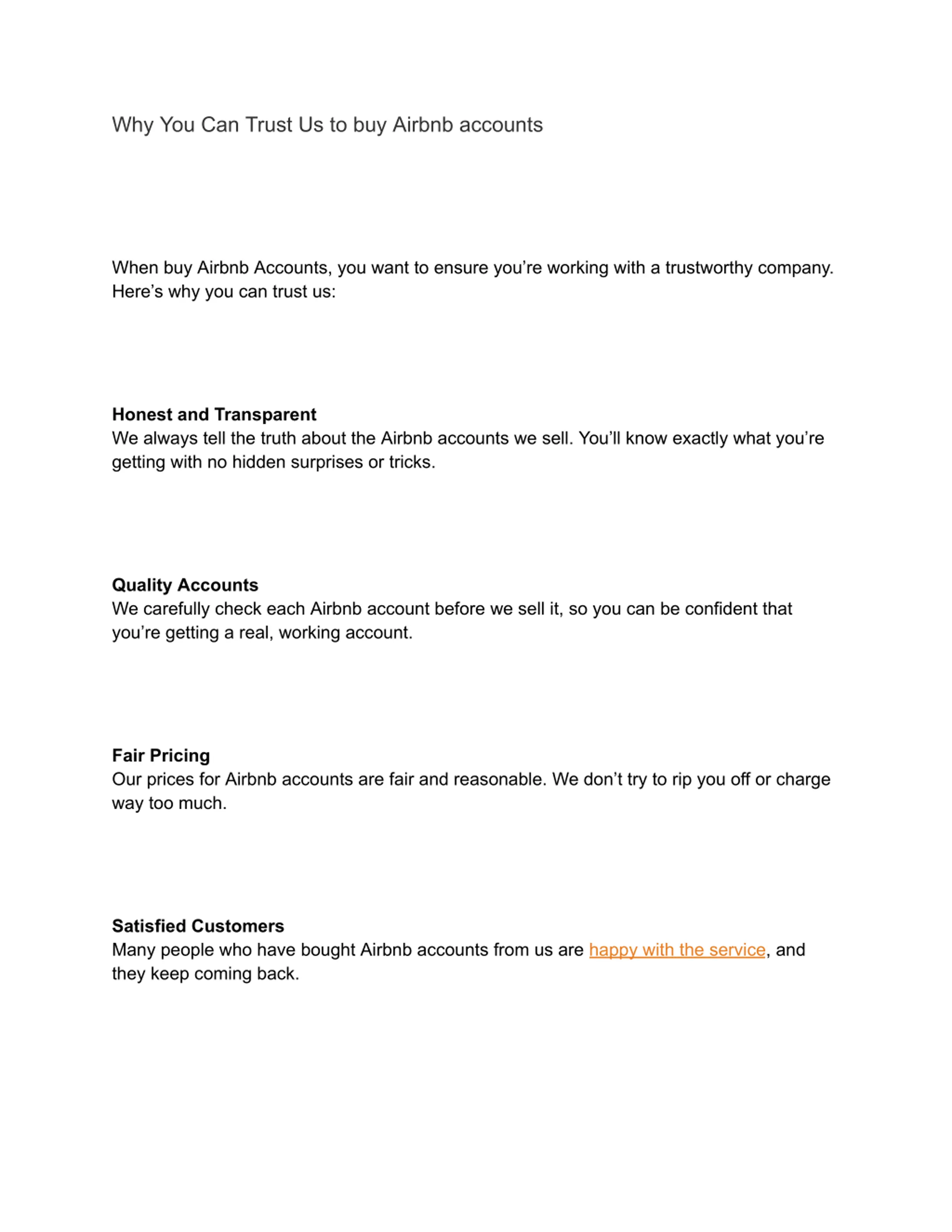 Why You Can Trust Us to buy Airbnb accounts When buy Airbnb Accounts, you want to ensure you re working with a trustworthy company. Here s why you can trust us: Honest and Transparent We always tell the truth about the Airbnb accounts we sell. You ll know exactly what you re getting with no hidden surprises or tricks. Quality Accounts We carefully check each Airbnb account before we sell it, so you can be confident that you re getting a real, working account. Fair Pricing Our prices for Airbnb accounts are fair and reasonable. We don t try to rip you off or charge way too much. Satisfied Customers Many people who have bought Airbnb accounts from us are happy with the service, and they keep coming back.