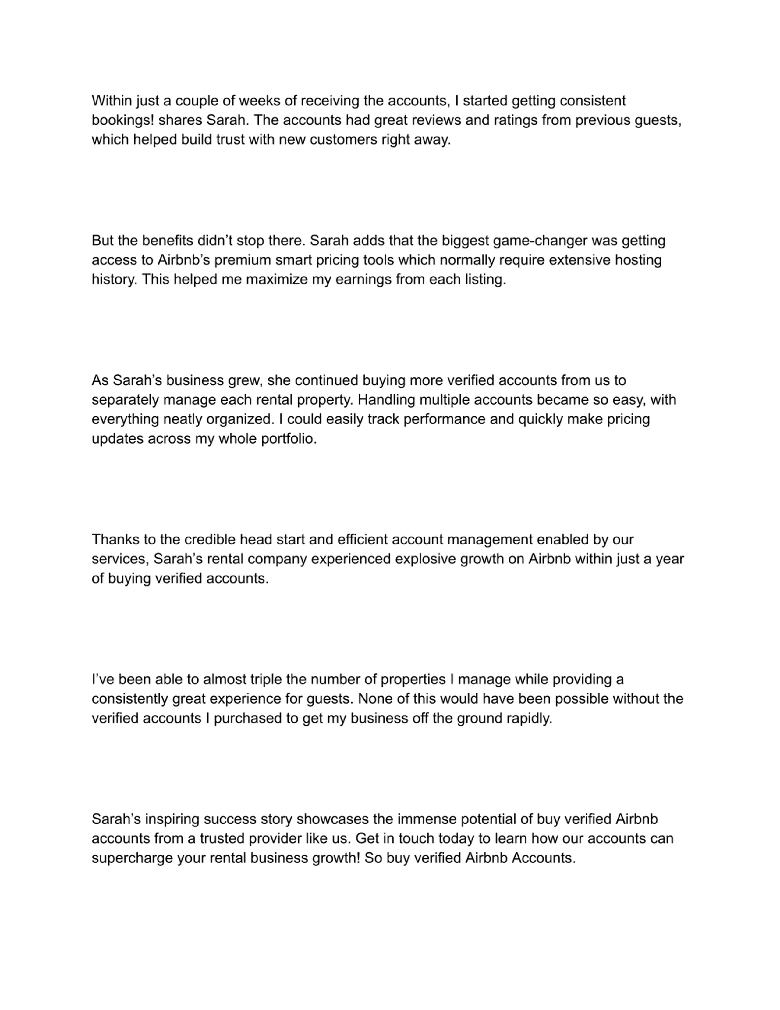 Within just a couple of weeks of receiving the accounts, I started getting consistent bookings! shares Sarah. The accounts had great reviews and ratings from previous guests, which helped build trust with new customers right away. But the benefits didn t stop there. Sarah adds that the biggest game-changer was getting access to Airbnb s premium smart pricing tools which normally require extensive hosting history. This helped me maximize my earnings from each listing. As Sarah s business grew, she continued buying more verified accounts from us to separately manage each rental property. Handling multiple accounts became so easy, with everything neatly organized. I could easily track performance and quickly make pricing updates across my whole portfolio. Thanks to the credible head start and efficient account management enabled by our services, Sarah s rental company experienced explosive growth on Airbnb within just a year of buying verified accounts. I ve been able to almost triple the number of properties I manage while providing a consistently great experience for guests. None of this would have been possible without the verified accounts I purchased to get my business off the ground rapidly. Sarah s inspiring success story showcases the immense potential of buy verified Airbnb accounts from a trusted provider like us. Get in touch today to learn how our accounts can supercharge your rental business growth! So buy verified Airbnb Accounts.