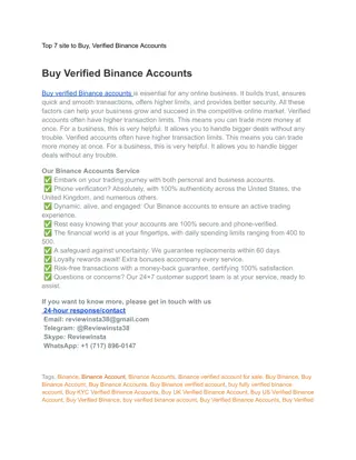 2. Security Issues Accounts sold by untrustworthy sellers may not be secure. They might keep copies of the login details or recovery information. This can lead to your account being hacked or misused. 3. Legal Problems Using someone else s verified account might cause legal issues. The original owner s details are on the account, and any illegal activity linked to it can get you in trouble. 4. Risk of Scams Many sellers offer fake or compromised accounts. Once you pay, they might disappear or sell you an account that doesn t work correctly. This can result in financial loss. 5. Lack of Full Control If you purchase an account, what you get does not necessarily belong to you one hundred per cent. The original owner may still be able to log in to the account or change the password, leaving you in the dark. Conclusion Buy Verified Binance Account is an excellent choice for online businesses looking to trade cryptocurrency safely and efficiently. A verified Binance account ensures secure transactions, builds trust with clients, and saves you the time and effort of completing the verification process yourself. So, buy Verified Binance Account.