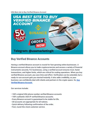 Telegram: @usamarketingit WhatsApp: +1 (501) 494-6400 https://usamarketingit.com/product/buy-verified-binance-account/ Why Do People Buy Verified Binance Accounts? Binance is perhaps one of the largest and most reputable companies that operates with cryptocurrencies in the modern world. Some would like to short-sell BTC/USD, invest in digital coins, and withdraw money via Binance. However, verifying a Binance account can sometimes take time and effort. This is why some buy verified Binance accounts instead of going through the verification process themselves. Here are some reasons why people buy verified Binance accounts: Getting your Binance account verified can take days or even weeks. People who want to start trading immediately often buy verified Binance accounts to save time and avoid delays. The Binance verification process entails offering personal details such as an ID or passport. It can be difficult for some people to produce these documents or make them public, or else they might feel privacy issues. Therefore, getting a real Binance account to make a purchase is more effortless. So, buy Verified Binance Account.