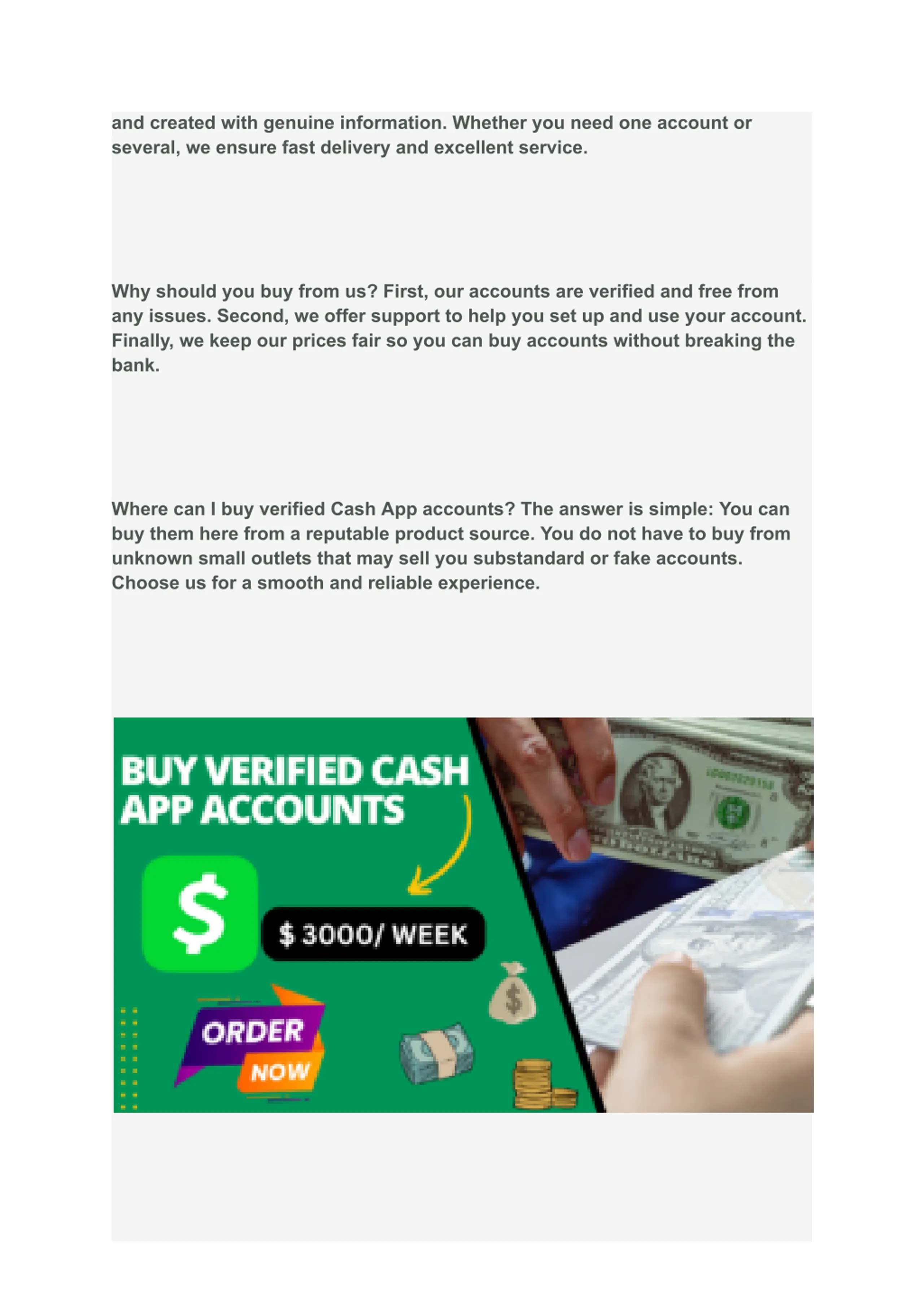 Why Do People Trust Us When Buy Verified Cash App Accounts? When it comes to buy verified Cash App accounts, trust is everything. People choose us because we put honesty and quality first. Let s explain why we stand out from the rest. Verified and secured accounts We provide fully verified Cash App accounts that are safe to use. Each account is checked for accuracy and security, so you can feel confident knowing your purchase is risk-free. So, buy verified Cash App accounts. Excellent Customer Support We have designed our work to require our team to support you closely throughout the process. Whether you have questions before or after a purchase, we re here to help. We offer fast replies and actual assistance. Fast and Easy Delivery