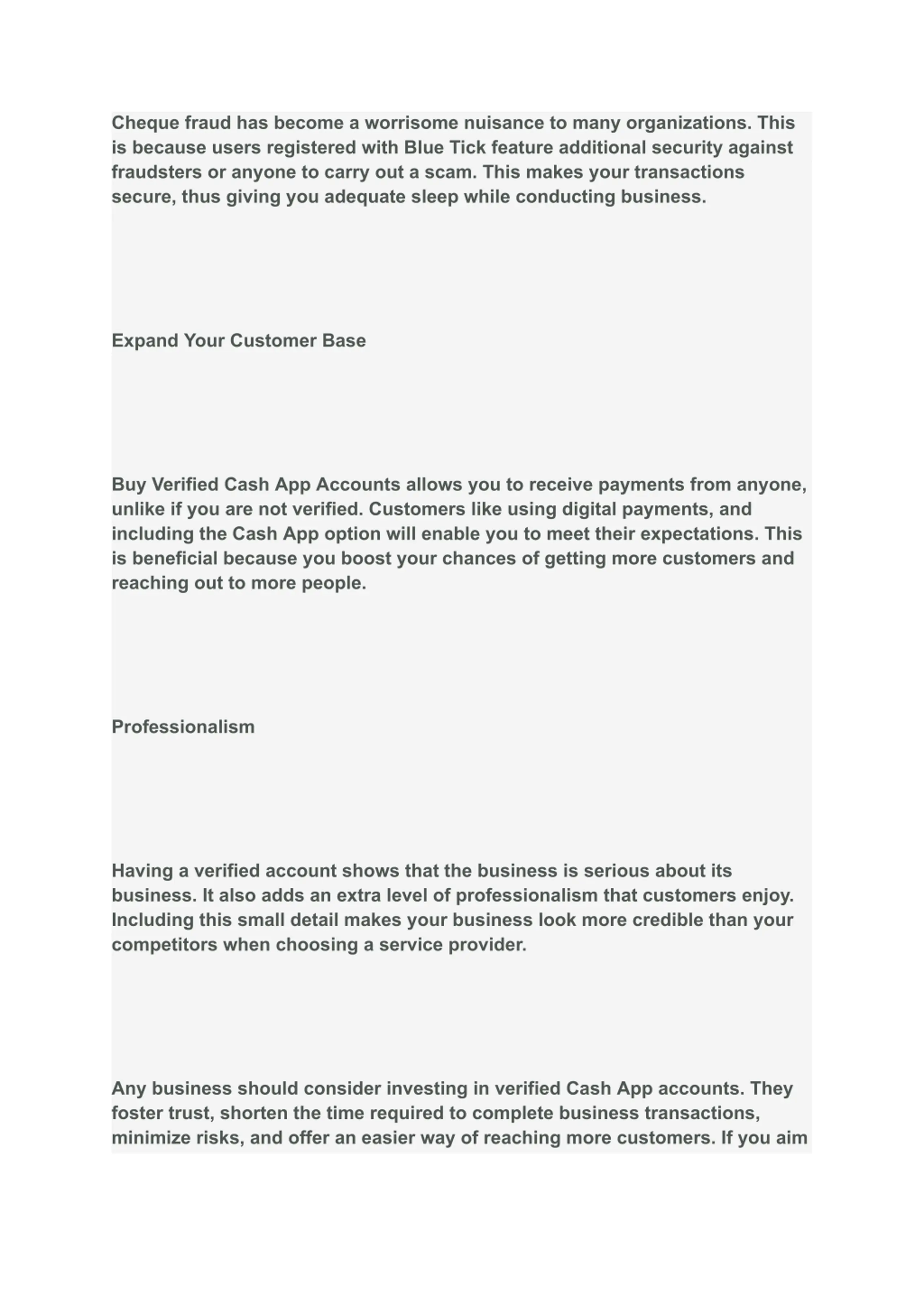 Cheque fraud has become a worrisome nuisance to many organizations. This is because users registered with Blue Tick feature additional security against fraudsters or anyone to carry out a scam. This makes your transactions secure, thus giving you adequate sleep while conducting business. Expand Your Customer Base Buy Verified Cash App Accounts allows you to receive payments from anyone, unlike if you are not verified. Customers like using digital payments, and including the Cash App option will enable you to meet their expectations. This is beneficial because you boost your chances of getting more customers and reaching out to more people. Professionalism Having a verified account shows that the business is serious about its business. It also adds an extra level of professionalism that customers enjoy. Including this small detail makes your business look more credible than your competitors when choosing a service provider. Any business should consider investing in verified Cash App accounts. They foster trust, shorten the time required to complete business transactions, minimize risks, and offer an easier way of reaching more customers. If you aim