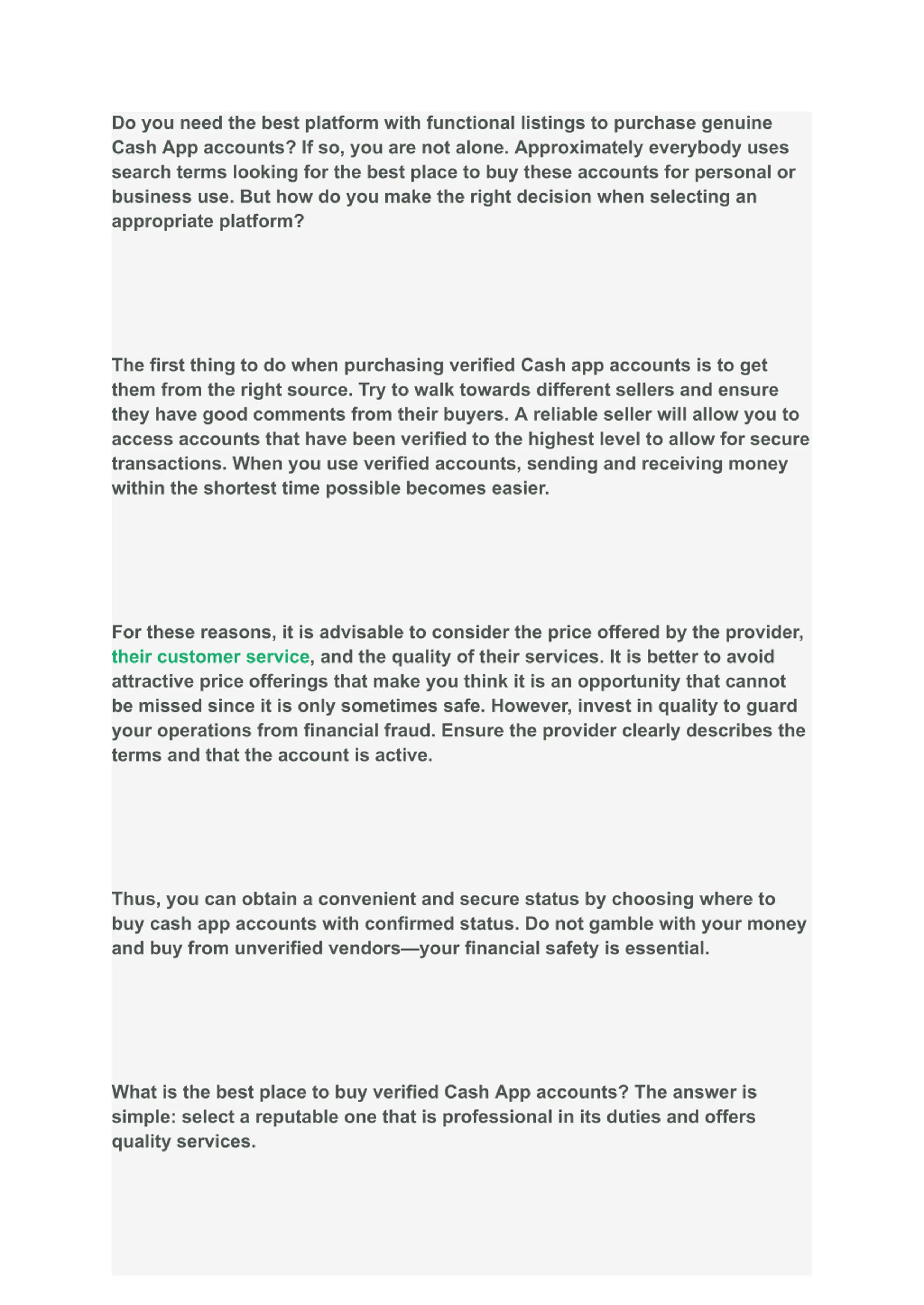 Do you need the best platform with functional listings to purchase genuine Cash App accounts? If so, you are not alone. Approximately everybody uses search terms looking for the best place to buy these accounts for personal or business use. But how do you make the right decision when selecting an appropriate platform? The first thing to do when purchasing verified Cash app accounts is to get them from the right source. Try to walk towards different sellers and ensure they have good comments from their buyers. A reliable seller will allow you to access accounts that have been verified to the highest level to allow for secure transactions. When you use verified accounts, sending and receiving money within the shortest time possible becomes easier. For these reasons, it is advisable to consider the price offered by the provider, their customer service, and the quality of their services. It is better to avoid attractive price offerings that make you think it is an opportunity that cannot be missed since it is only sometimes safe. However, invest in quality to guard your operations from financial fraud. Ensure the provider clearly describes the terms and that the account is active. Thus, you can obtain a convenient and secure status by choosing where to buy cash app accounts with confirmed status. Do not gamble with your money and buy from unverified vendors your financial safety is essential. What is the best place to buy verified Cash App accounts? The answer is simple: select a reputable one that is professional in its duties and offers quality services.